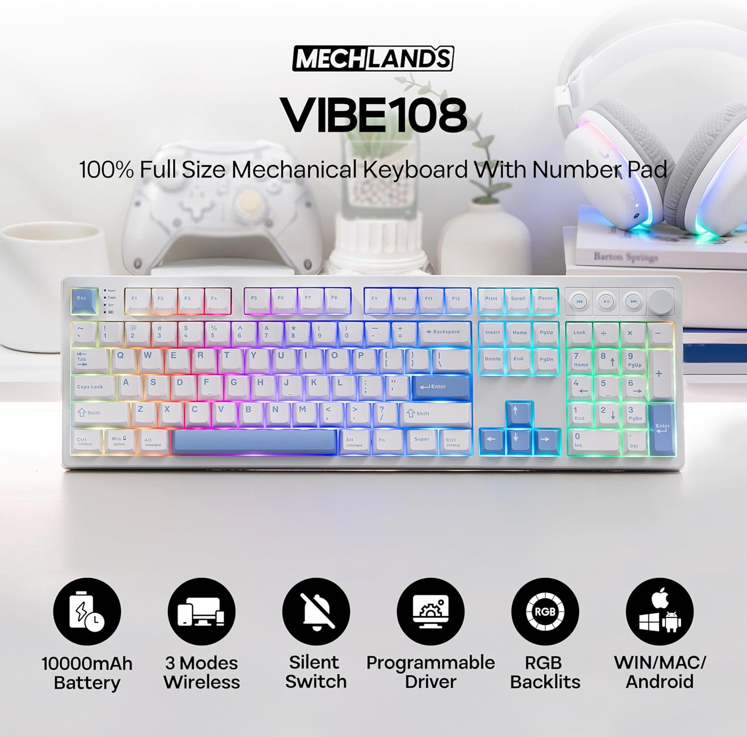 MechLands Vibe108 Full Size Mechanical Keyboard with Knob & Multimedia Buttons, Wireless Gaming Keyboard with 10000mAh Battery, RGB Backlits, 104 Keys Hot Swappable, Custom Driver (Vela Silent Switch)