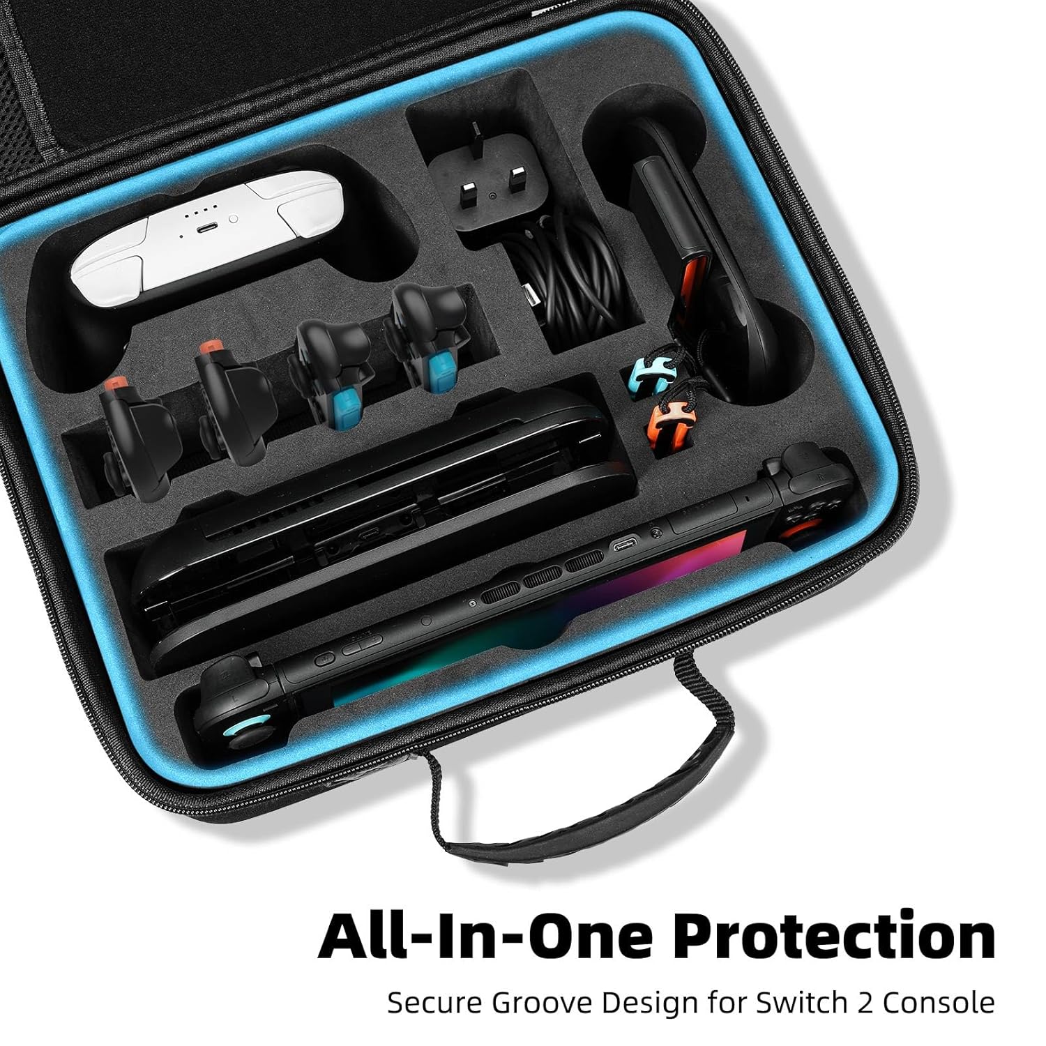 All-in-One Switch 2 Case: This Switch 2 travel case consolidates your entire Switch 2 setup. It can store the console, charging dock, AC adapter, Pro Controller, Joy-Con grips, straps, HDMI cable, and power bank. It features a zippered mesh pocket for accessories (like Switch 2 steering wheels) and 21 slots for Switch 2 & Switch games. Enjoy grab-and-go gaming (Accessories not included)