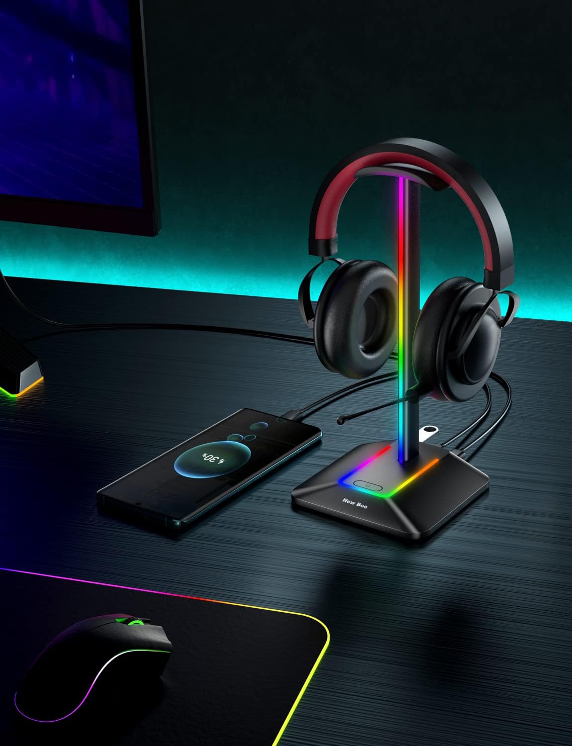 New bee RGB Headphone Stand with 1 USB-C Charging Port and 1 USB Charging Port, Desk Gaming Headset Stand with 7 Light Modes for All Earphone Accessories (Black)