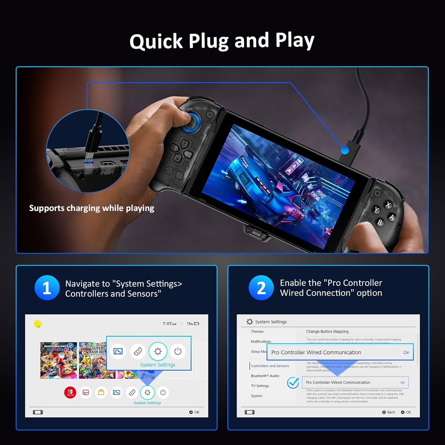 【Plug-and-Play Convenience】Indulge in the simplicity of plug-and-play ease on your Nintendo Switch, with no need for intricate software installations or setups. Furthermore, relish the convenience of swift PD charging through the USB Type-C port, ensuring you can keep playing without enduring long waiting times.