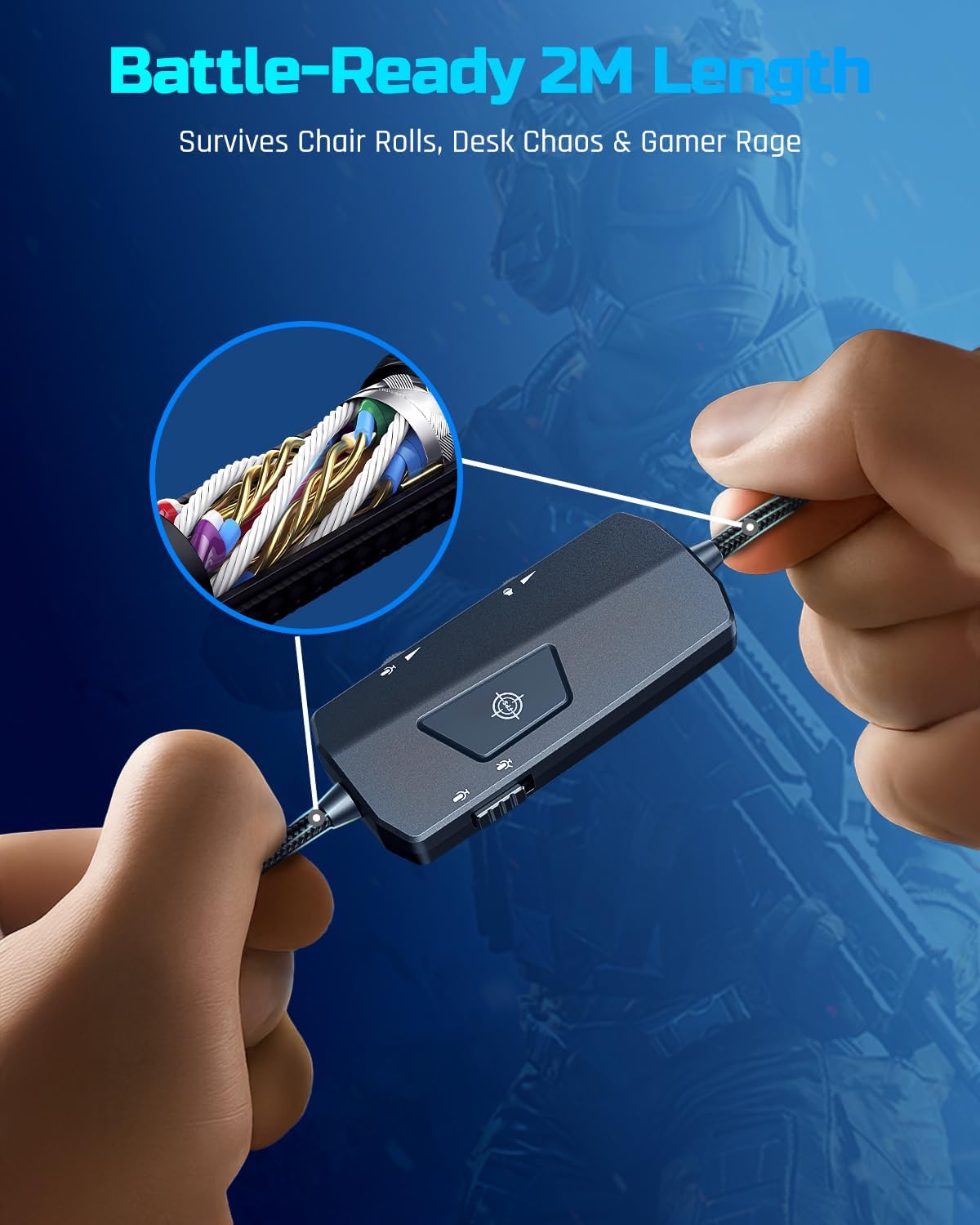 One-Click FPS Mode: Gain an instant competitive edge with our dedicated FPS button—one press activates dynamic audio processing, high frequencies to pinpoint enemy movements. The in-line controller keeps you in command: adjust master volume seamlessly with the tactile scroll wheel, fine-tune mic volume for crystal-clear comms, and mute instantly with the dedicated mic switch—all without interrupting gameplay.