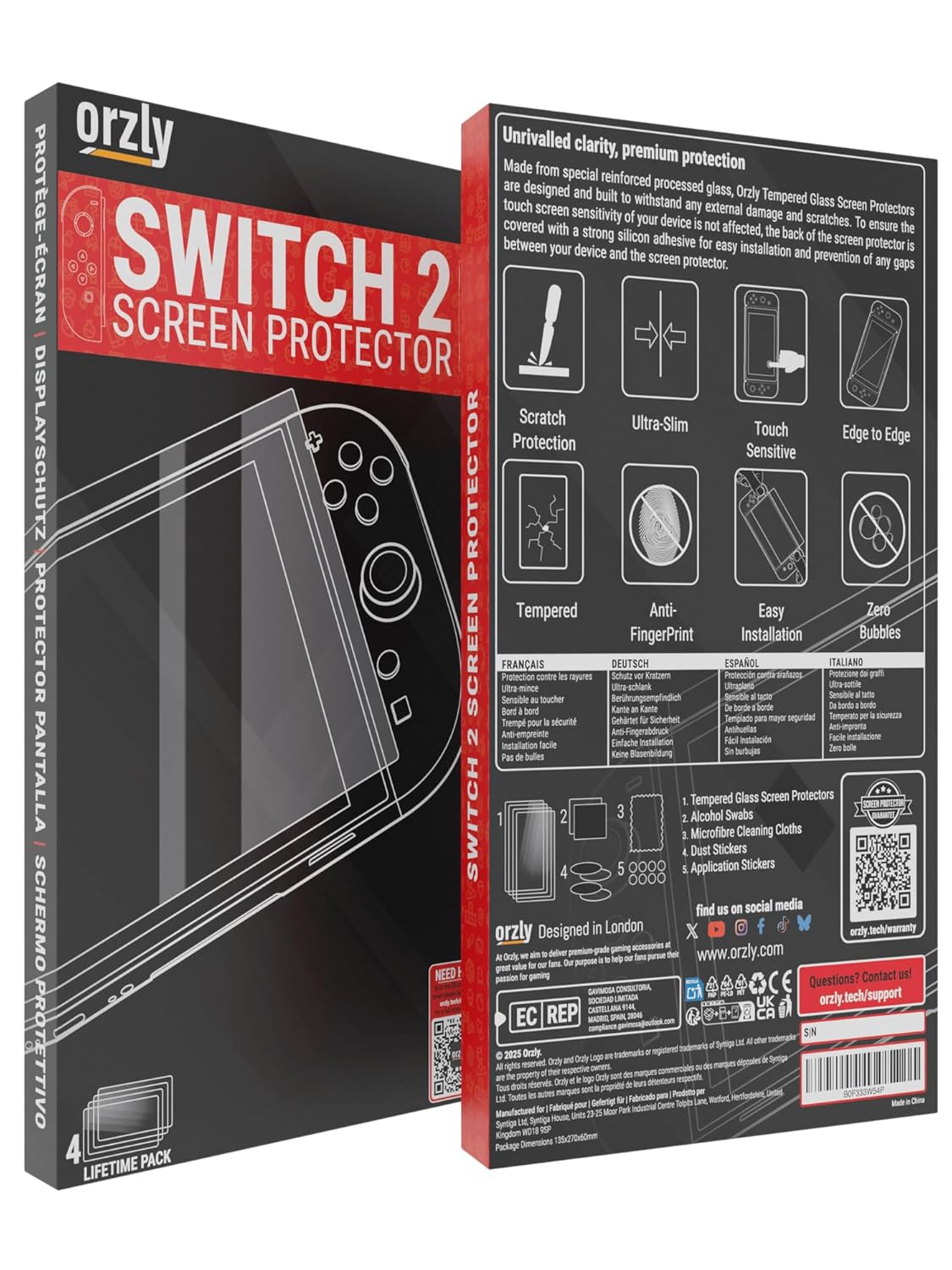 Nintendo Switch 2 Protection Orzly’s tempered glass screen protectors are tailor-made for the Nintendo Switch 2 [2025], offering precise edge-to-edge coverage for maximum protection. Designed exclusively for this console, they’re not compatible with earlier models like the Nintendo Switch, Switch OLED, or Switch Lite. Keep your screen safe from scratches, smudges, and everyday wear with these essential Switch 2 accessories, perfect for upgrading your gaming setup. Crystal-Clear Tempered Glass Crafted with real tempered glass, our Nintendo Switch 2 screen protectors feature 9H hardness for unbeatable scratch and impact resistance. The ultra-thin 0.24mm design ensures seamless touch sensitivity, making every swipe, tap, and scroll responsive. With 99% transparency, your console’s vivid colors and sharp details remain uncompromised, providing a premium gaming experience that’s both immersive and crystal-clear. Smudge-Resistant Coating Say goodbye to fingerprints and smudges with our special oleophobic coating, designed to keep your Nintendo Switch 2 screen spotless. This anti-fingerprint technology not only resists grease but also makes cleaning quick and easy. Combined with the smooth tempered glass surface, this coating ensures your screen looks and feels brand-new, enhancing your gaming experience without any distractions. Shatter-Resistant Protection Protect your Nintendo Switch 2 with tempered glass that absorbs shocks and prevents shattering. Even during accidental drops, the glass stays intact to avoid dangerous shards, keeping your console and loved ones safe. This premium impact resistance combines with scratch-proof durability to offer all-around protection, making it an essential upgrade for your Nintendo Switch 2 accessories collection. Easy Bubble-Free Installation Installing your Orzly Nintendo Switch 2 screen protector is fast and hassle-free. Each pack includes everything you need: dust wipes, a microfiber cloth, and alignment stickers for a perfect, bubble-free finish every time. Our precise cut ensures a flawless fit, so your screen stays secure and protected without interfering with gameplay. Enjoy professional-grade protection in just minutes. Quad Pack for Long-Term Value With Orzly’s Nintendo Switch 2 screen protector quad pack, you’re ready for long-term protection. Each pack includes four tempered glass protectors, perfect for replacements or sharing with family. Designed for durability and ease of use, this value-packed set is ideal for gamers who want to keep their Nintendo Switch 2 screen looking flawless for years to come. It’s the ultimate accessory for safeguarding your console.