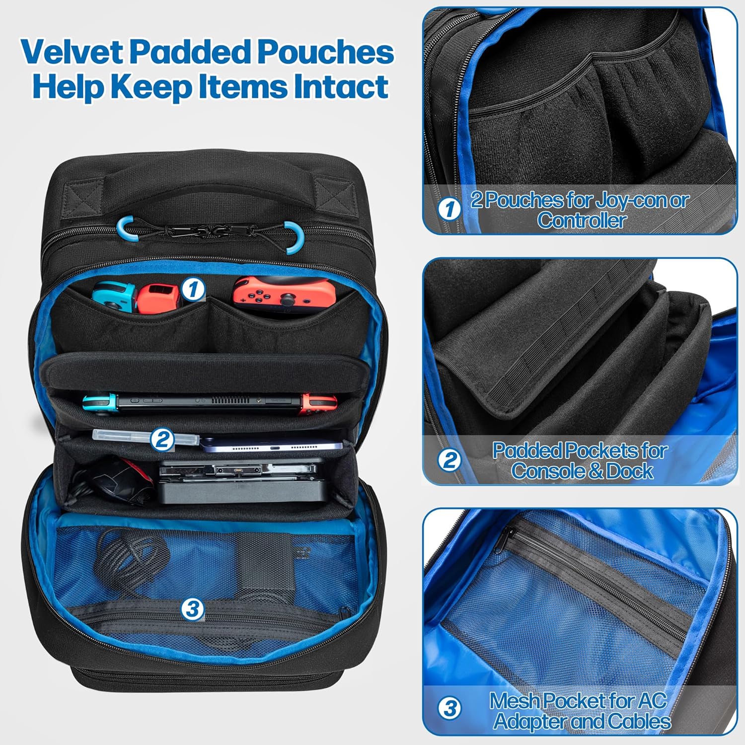 The padded velvet pockets can keep your Joy-Cons and console from scratches.