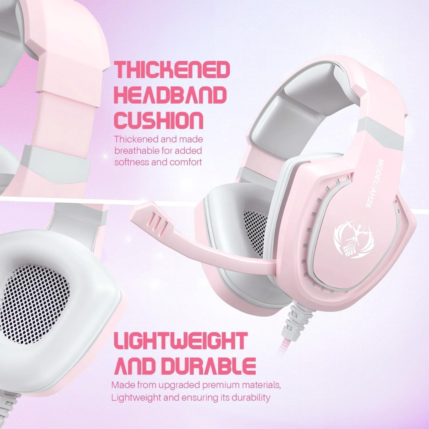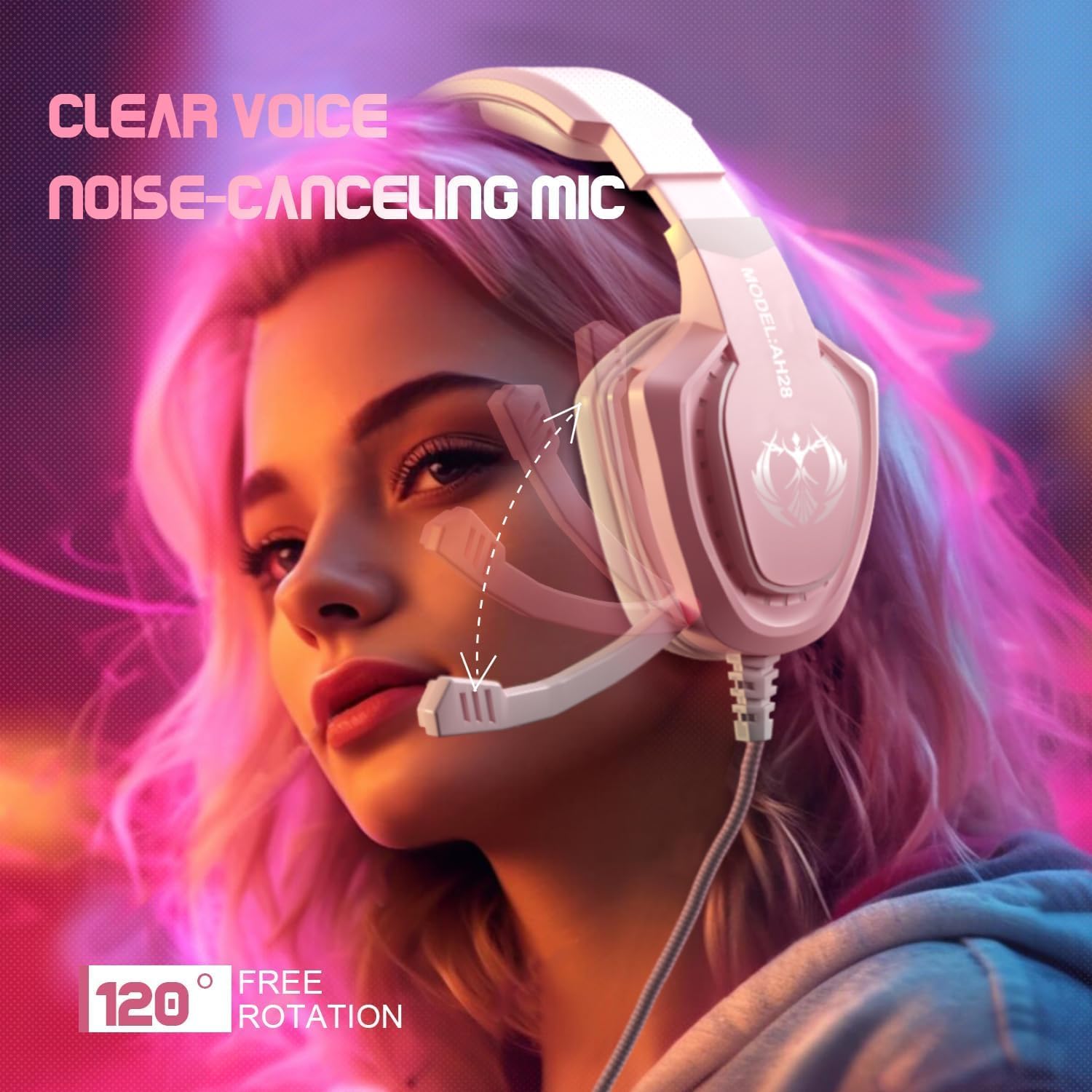 Pink Gaming Headset with Mic for Girls Women, Stereo Surround Sound Wired Over-Ear Headphones with Microphone, Bass, Compatible with PC Mac Computer PS5 Xbox PS4 Laptop