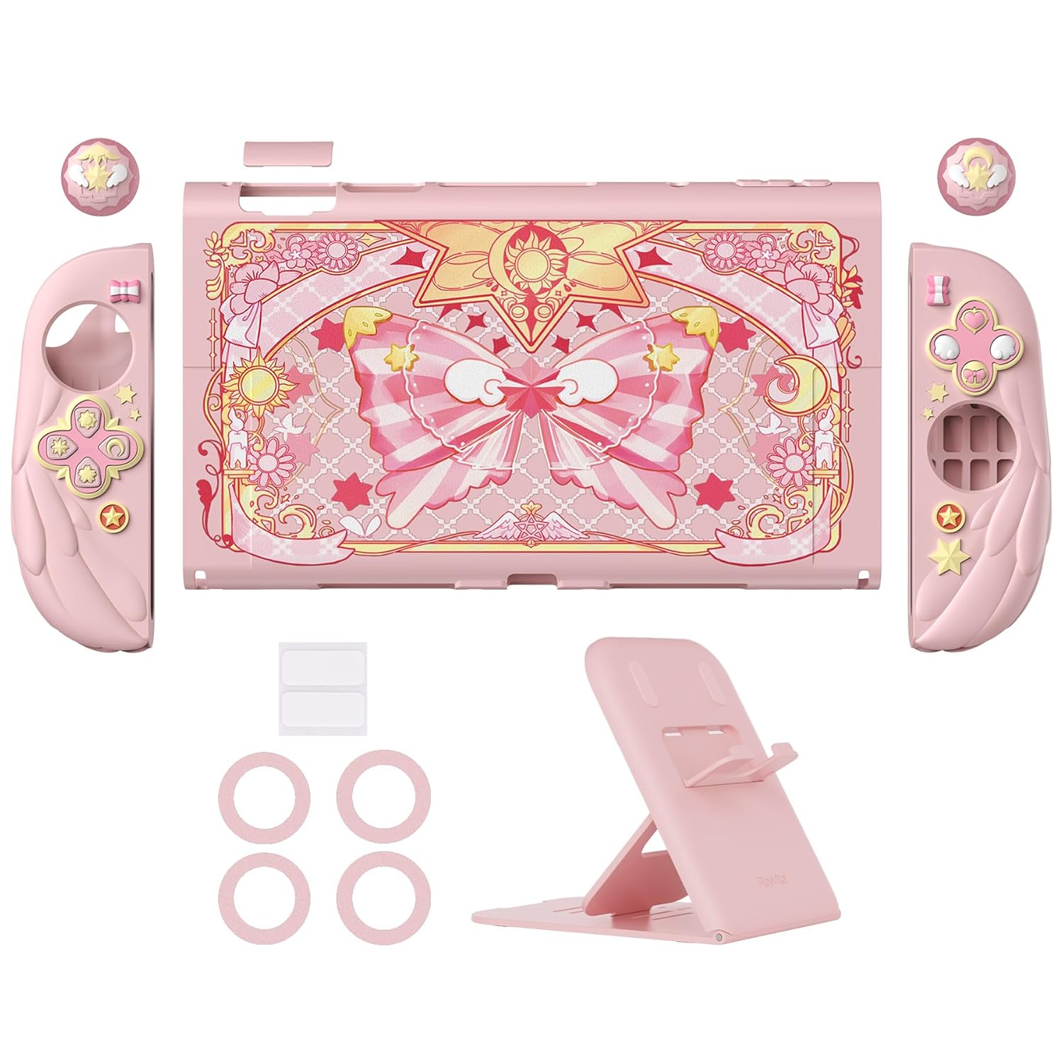 【Complete Matching Set – Dock-Friendly & Functional】Includes 1 dockable PC back case, 2 pastel silicone Joycon covers, and 2 thumbstick caps. A kawaii and functional accessory bundle for Switch 2 players who love magical anime-style designs