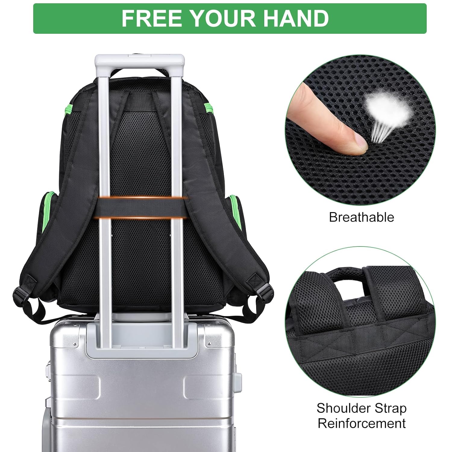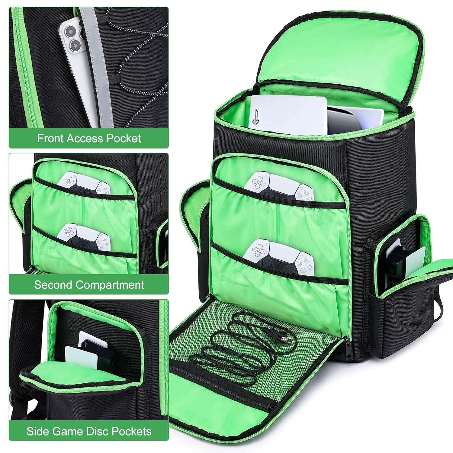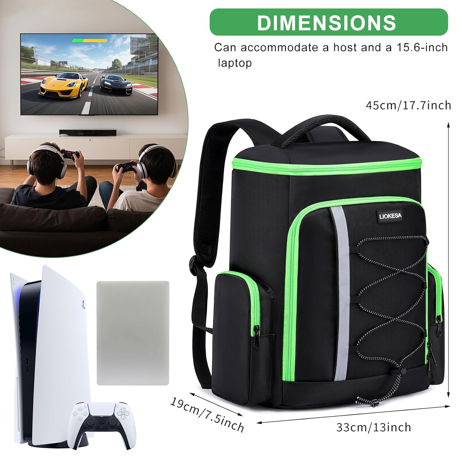 PS5 Backpack, Gaming Carry Backpack Compatible with Playstation 5 / PS5 Slim / PS4 / Xbox One, Travel Carrying Case with Multiple Pockets for 15.6” Laptop and Gaming Accessories, Black& Green