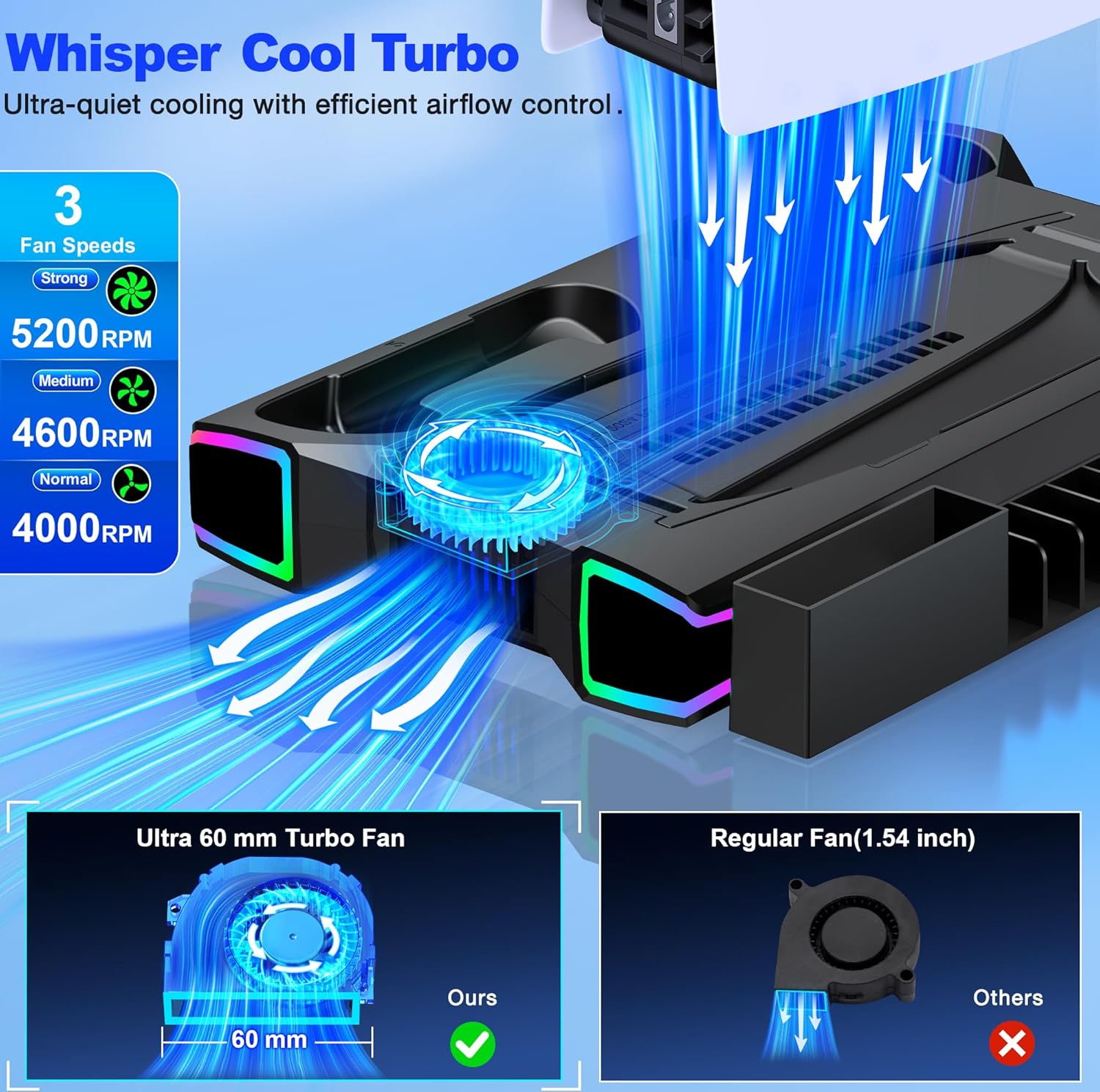 Tubocharged Cooling Power: Say goodbye to overheating! Our upgraded 100W turbo cooling fan for ps5 cranks up the cooling power by 3x, with three adjustable speeds to keep things chill during your most intense gaming marathons. Plus, ps5 cooling station remembers your favorite fan speed!—just like your trusty sidekick