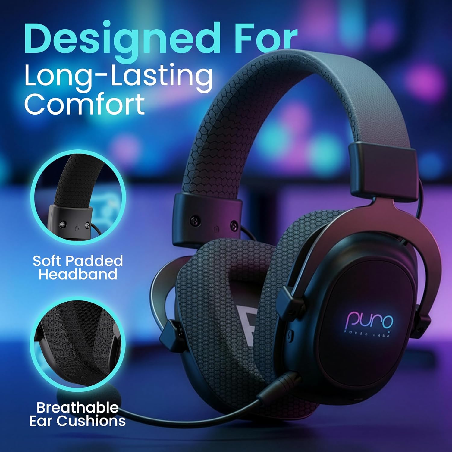 COMFORTABLE DESIGN FOR EXTENDED GAMING: Experience great comfort with the PuroGamer-BT gamer headphones with mic. Soft, breathable ear cushions and an adjustable, padded headband minimize pressure, ensuring you stay comfortable through long gaming marathons.