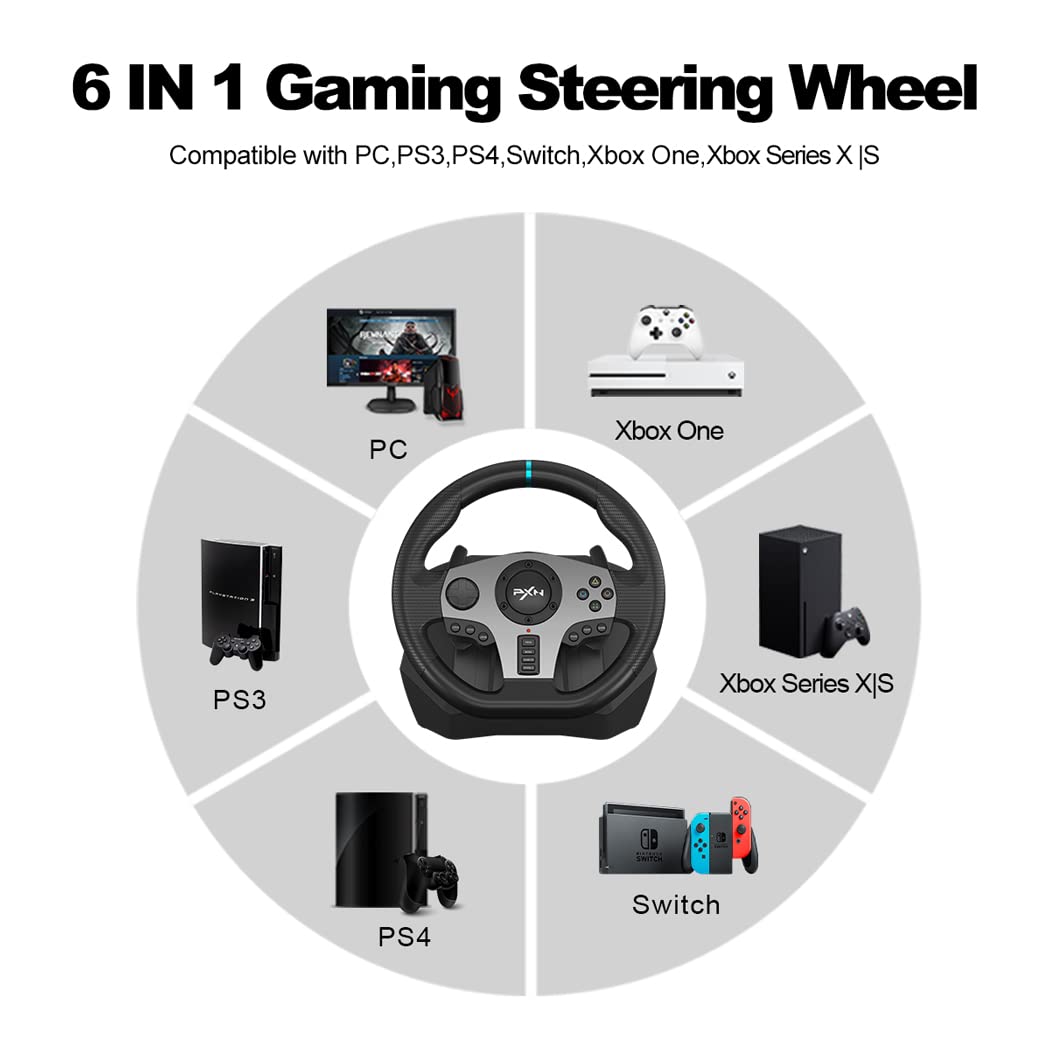 【MORE RACING GAMES】: PXN V9 steering wheel can provide PC platform with Forza Horizon 4/5, iRacing, European Truck Simulation, Farming Simulator, F1 2023/2024, Assetto Corsa, etc.; X-box host can be adapted to Forza Horizon 4/5, Dust 2.0, Forza Motorsport series, Racing Project 2,Need for Speed Rivals, etc.; PS4 host includes Need for Speed 20, WRC 8/9, Super Touring Car, Driving Club, Snow Runner, The Crew 2 etc.; Switch host includes Asphalt, Sonic Racing, Mario Kart and other games.