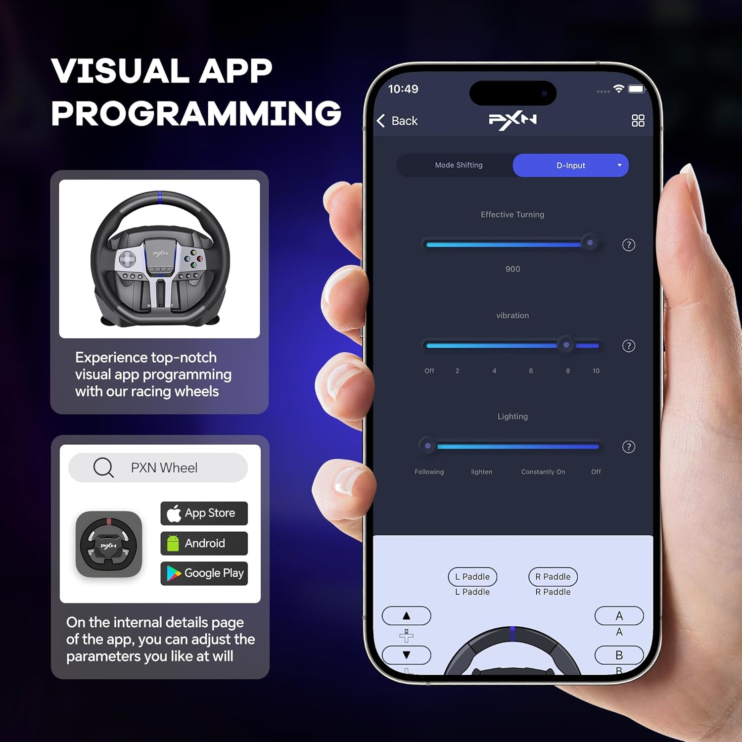 Enhanced Racing Performance: The PXN V9 Gen2 racing wheel features a sleek new design and cutting-edge gaming technology. Equipped with a 16-bit high-precision magnetic encoder, dual-motor force feedback with asymmetric vibration, Hall effect linear pedals, a 6+R H-pattern shifter, dual paddle shifters, and support for the exclusive 【PXN Wheel】 app, it delivers an immersive, next-level racing experience.