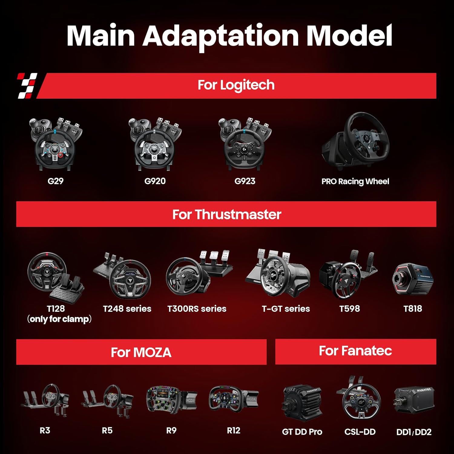 Universal Compatibility for Pro & Casual Racers: This racing simulator cockpit is compatible with Logitech (G PRO/G29/G920/G923), Fanatec (GT DD Pro/CSL-DD/DD1/DD2), Moza (R3/R5/R9/R12), and Thrustmaster (T248/T300RS/T-GT/T598/T818)