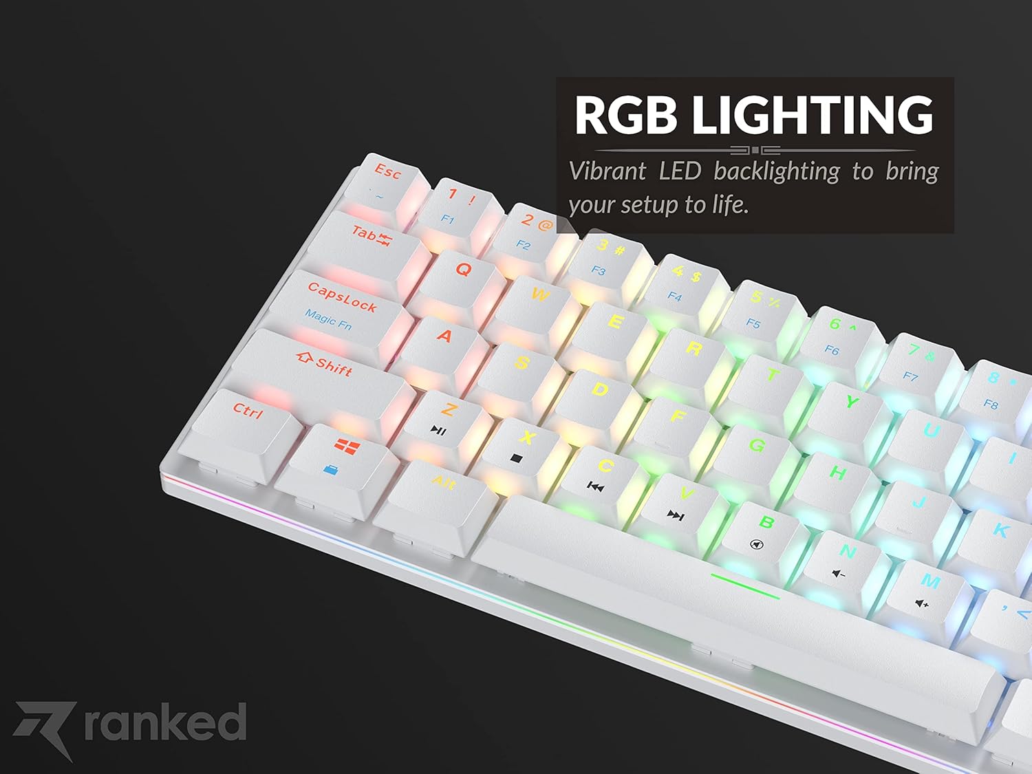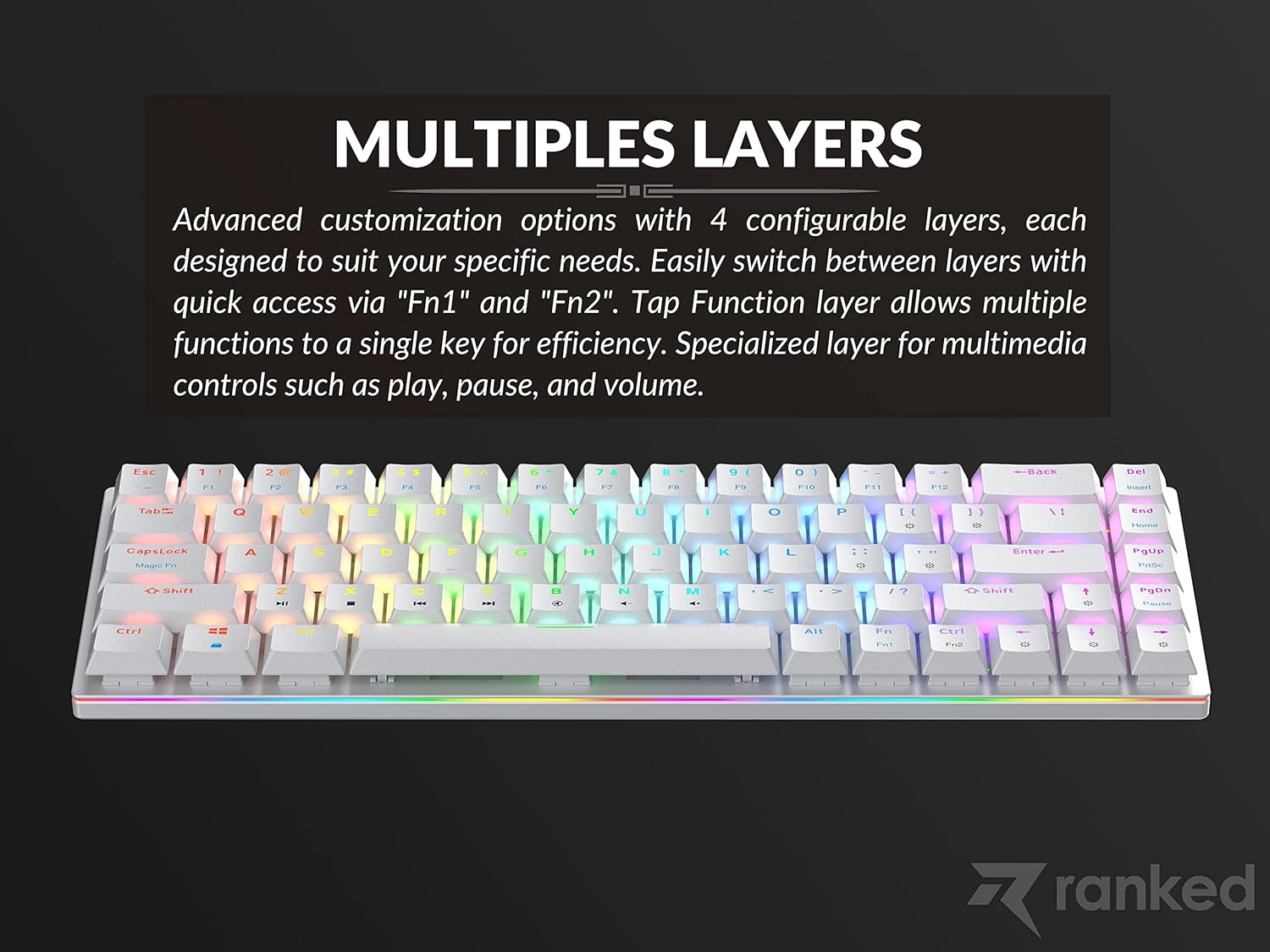 TAP Layer: The Guardian also feature Ranked’s own take on “tap mode”, which allows you to assign a single quick-tap function to any key on the keyboard.Magic FN: The Guardian G65 keyboard features a Magic FN function that is accessed by holding down the Caps Lock key. This allows users to access a secondary set of functions on the keys, such as media controls, volume adjustments, or custom macros, without having to take their hands off the main keyboard. This feature is useful for gamers and power users who need quick access to a variety of different functions during gameplay or while working on a computer.