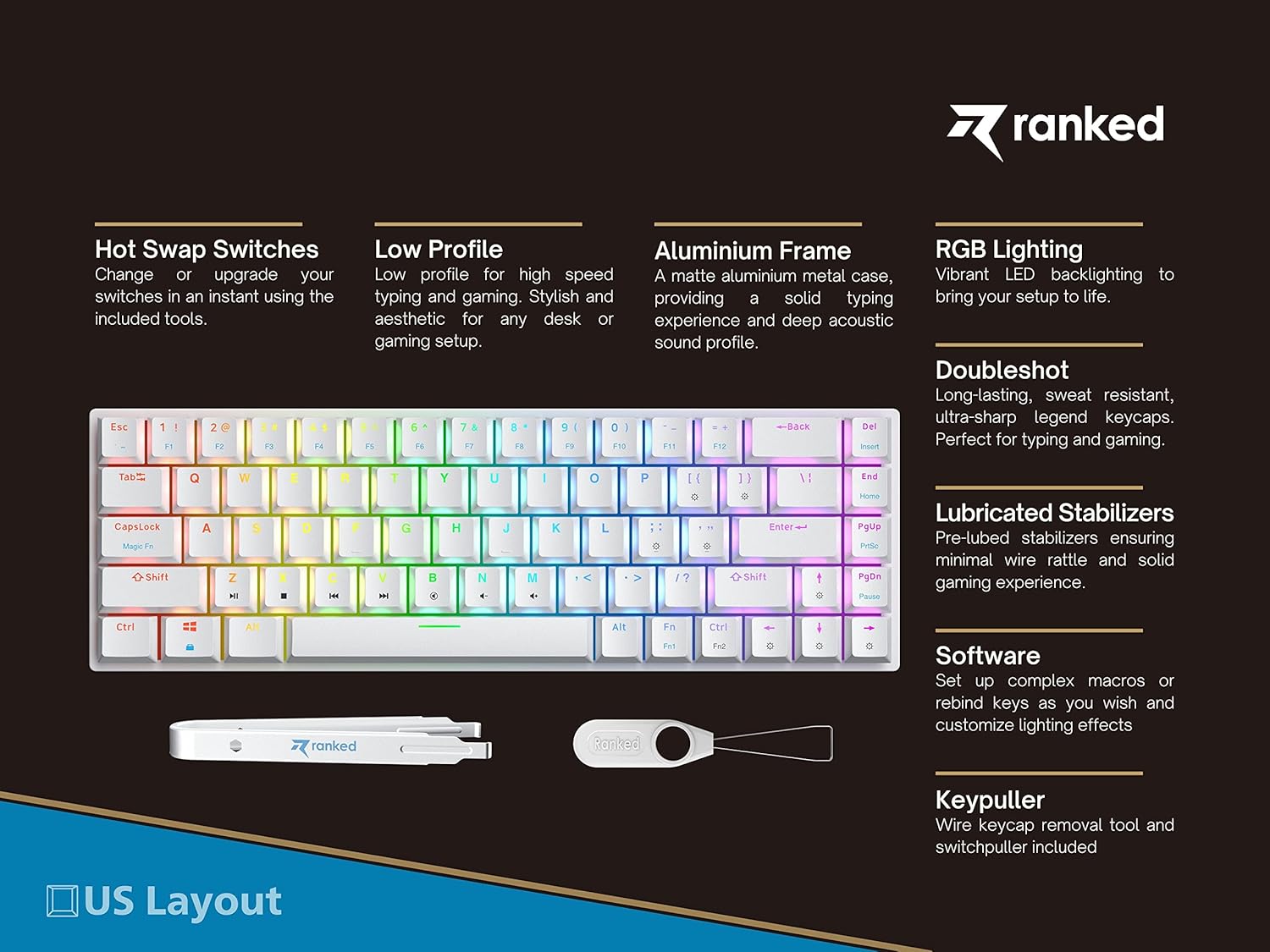 The Guardian g65, is a low-profile mechanical gaming keyboard manufactured by Ranked. It offers a solid typing experience and deep acoustic sound profile with Aluminium Frame, customizable RGB lighting system, hot-swappable switches, pre-lubed stabilizers, support for macro programming, and more. It also has a low profile design that is suitable for high-speed typing and gaming, and compatibility with both Mac and Windows operating systems.
