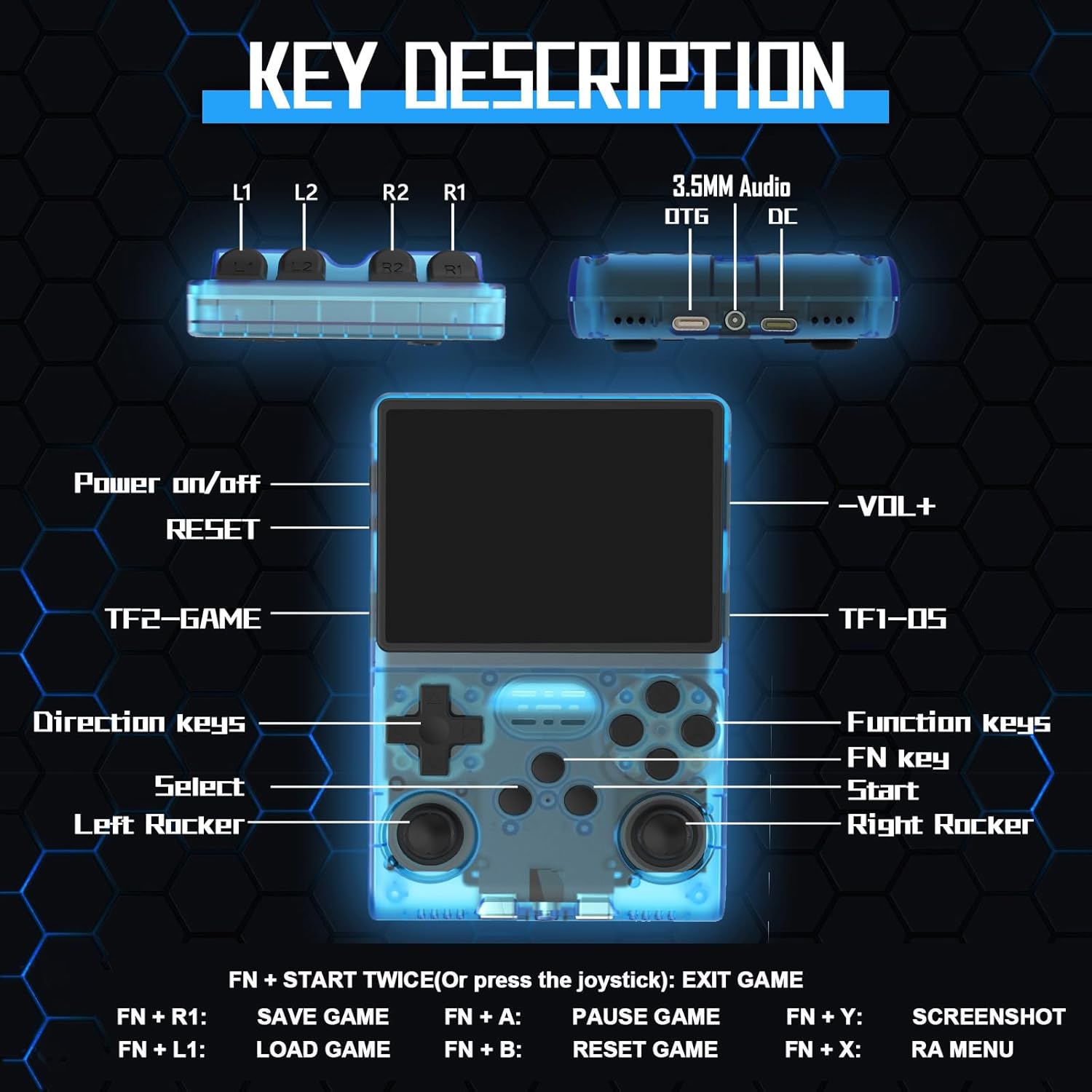 【Note】Please note that there is an error in the manual. The SELECT key needs to be changed to FN, for example: FN+START can exit the game (some games require pressing both joysticks at the same time to exit)