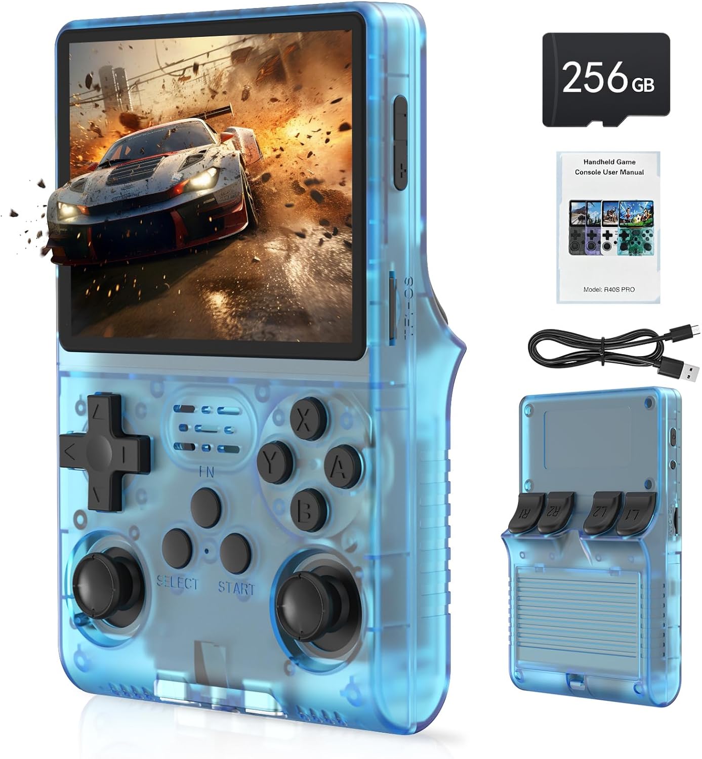 【R40S PRO new system】This handheld game console is equipped with 1.5GHz 64-bit RK3326 CPU, Mali-G31MP dual-core GPU, 4GB*2 RAM DDR3L; the new operating system provides a more responsive and smoother experience. Pre-installed with 30000 games, it supports 45 simulators, and the 256GB extended memory allows for adding more games.