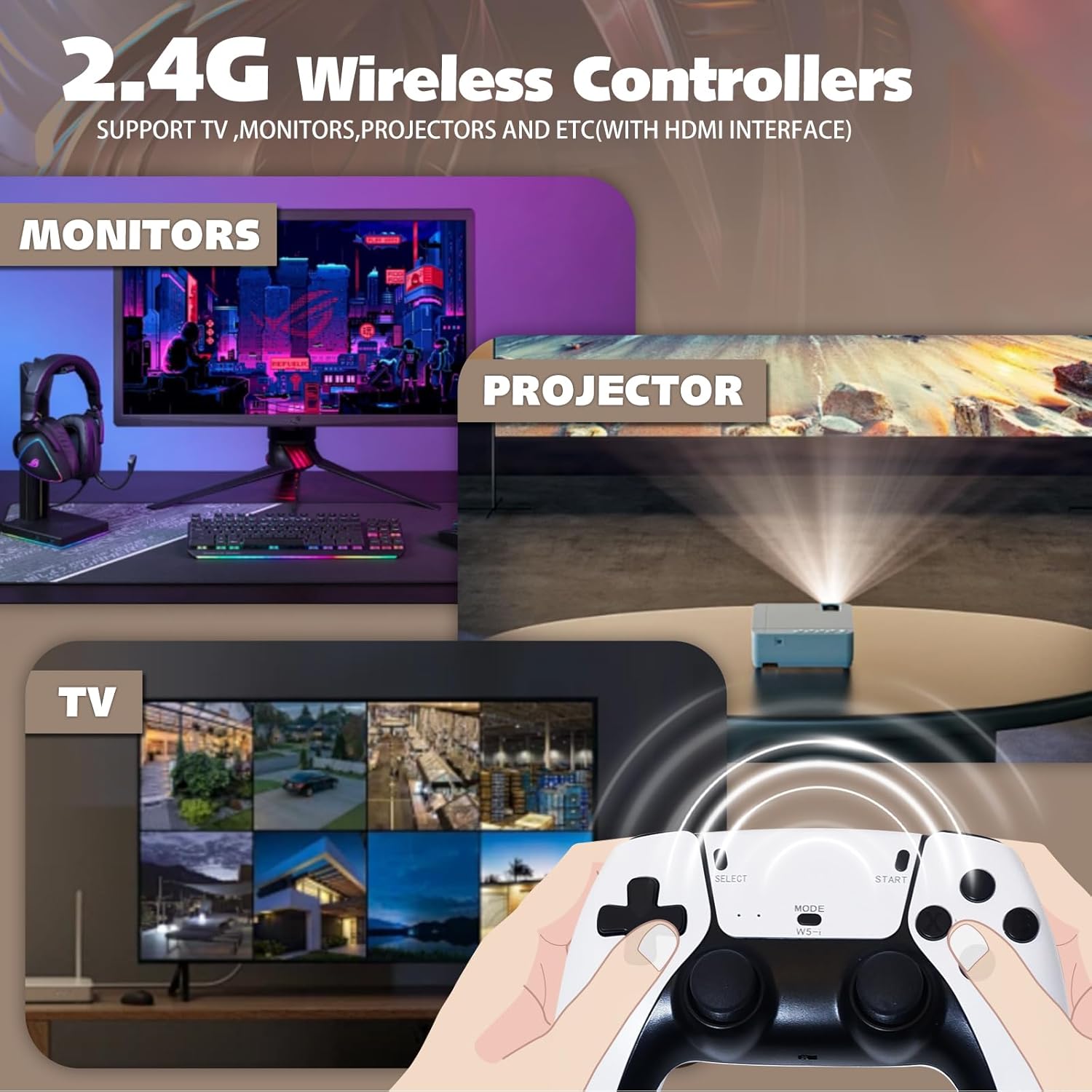 【2.4GHz Wireless Multiplayer Support】Equipped with two 2.4GHz wireless controllers, this console lets two players join the action simultaneously. With a stable connection range of up to 32.8 feet and virtually zero lag, you can enjoy smooth, cable-free gaming anywhere. (Controllers require 4 AAA batteries; not included.)