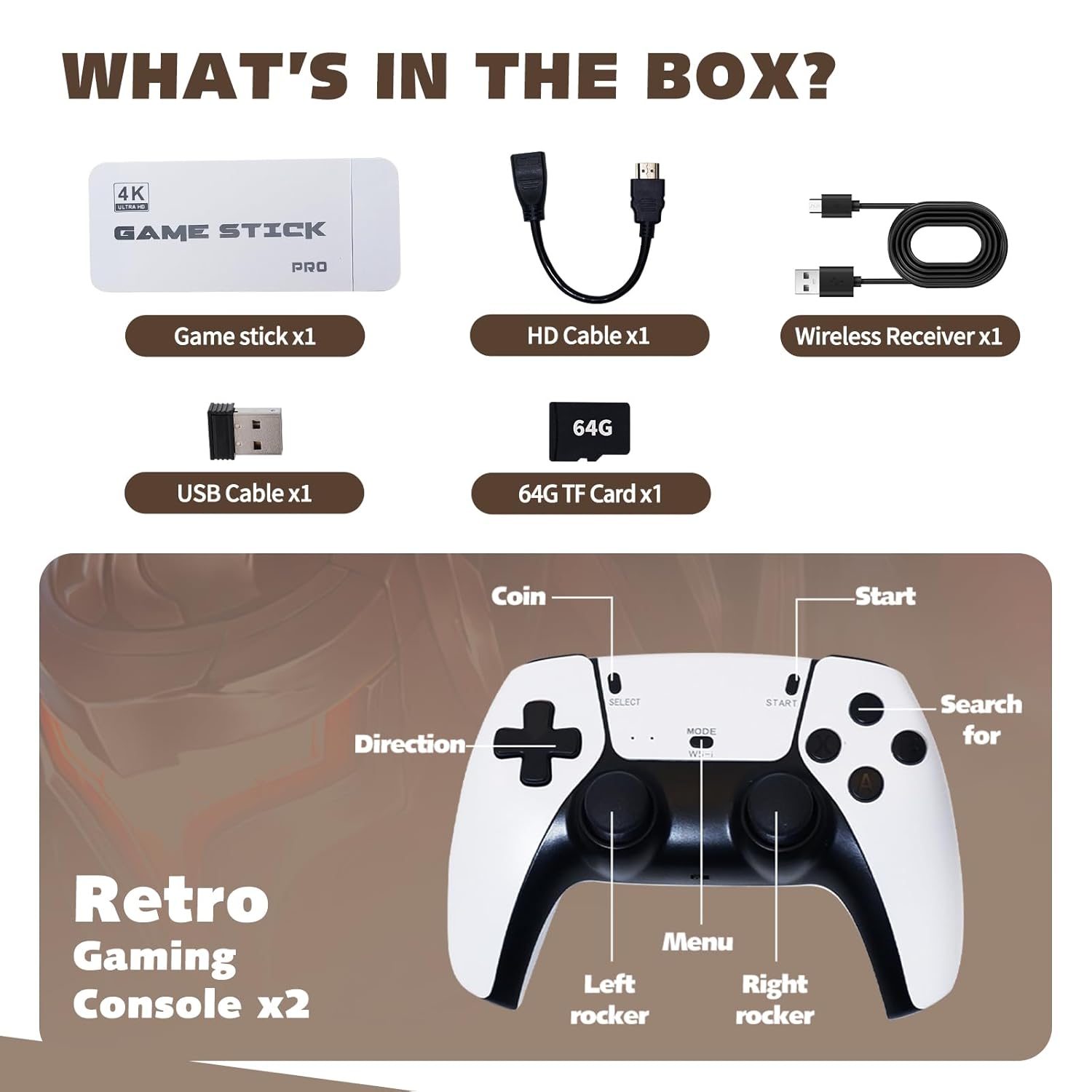 Retro Gaming Console Stick – Plug & Play Video Game System with 23 Built-in Emulators, 20,000+ Retro Games, 4K HDMI Output, Dual 2.4GHz Wireless Controllers, Classic Arcade Experience for TV-64G