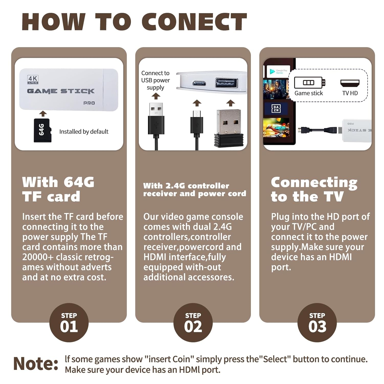 【Tips】When “COIN” appears on the screen, press the “SELECT” button to simulate inserting a coin, just like in classic arcade machines. For optimal performance, use a power adapter with an output of 2A or higher.The 64GB memory card is pre-installed in the game stick—please ensure it remains properly inserted during use.