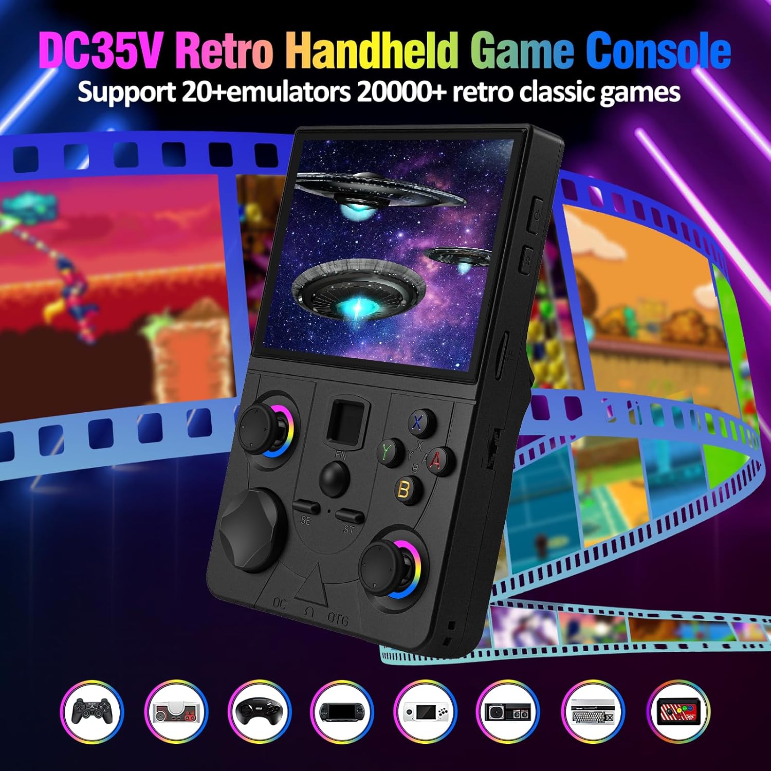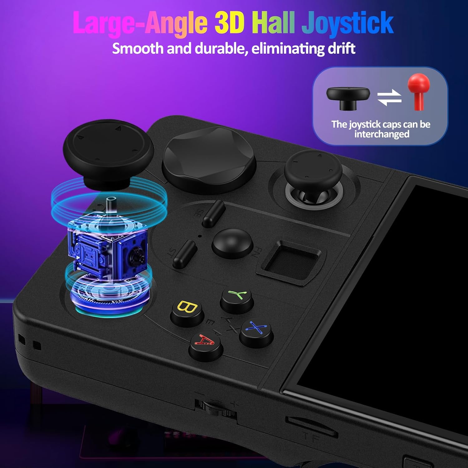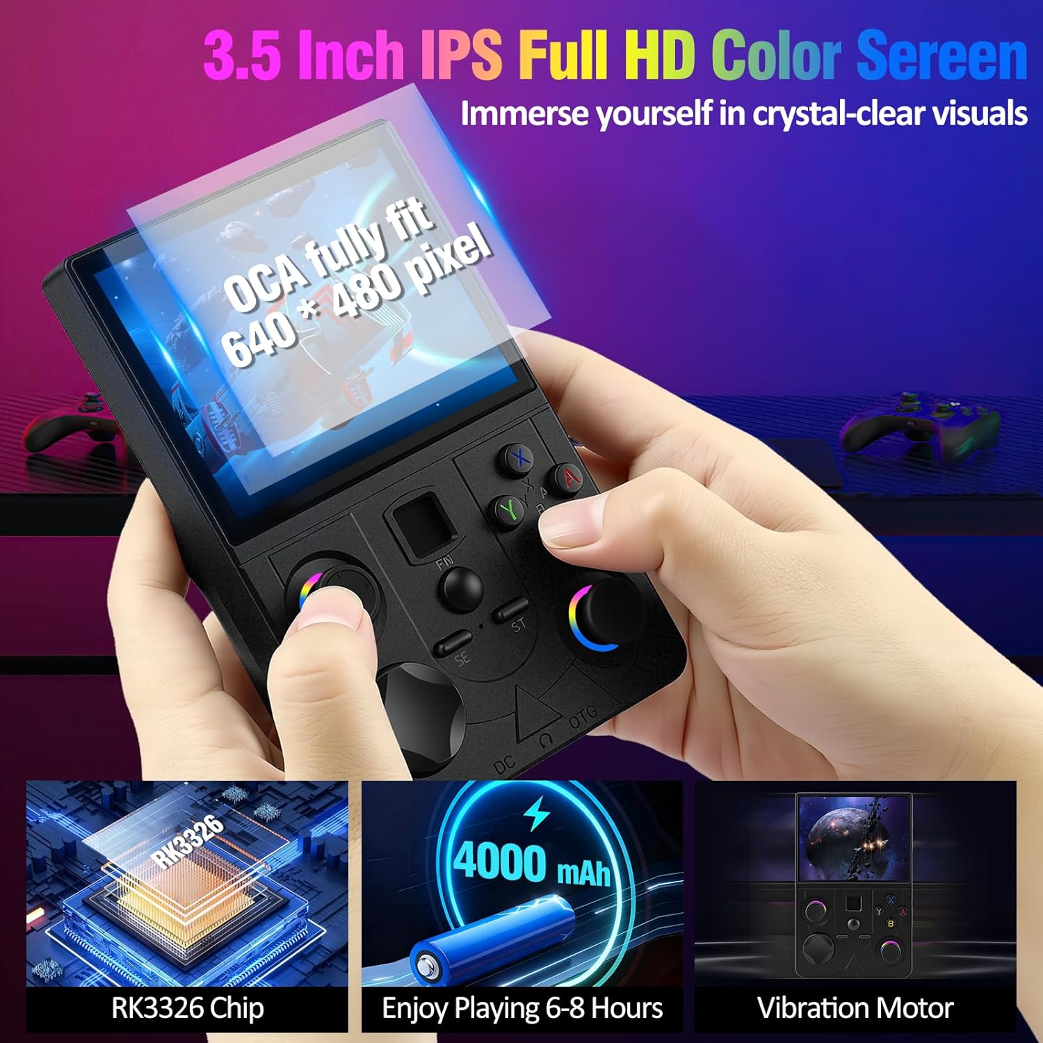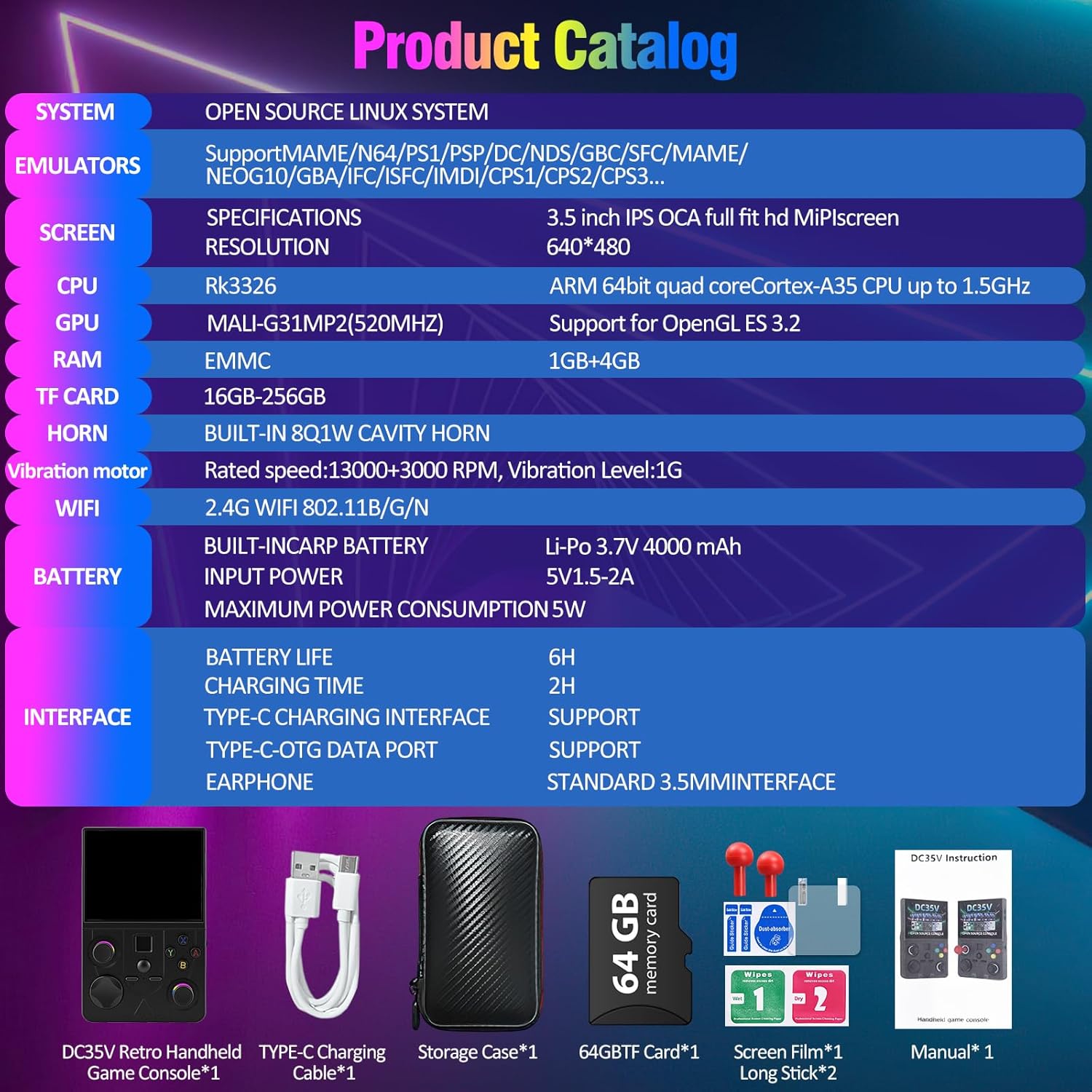 【Upgrade DC35V Retro Gaming Console】Unleash your creativity with DC35V handheld game console, powered by an Open Source Linux System! Equipped with a robust 1.5Ghz 64-bit RK3326 CPU and Mali-G31MP dual-core GPU, this retro gaming console delivers smooth, lag-free performance. The included 64GB memory card offers ample storage, and you can easily expand it to add even more games. Perfect for tinkerers and gamers alike, this retro handheld lets you customize your gaming experience like never before.