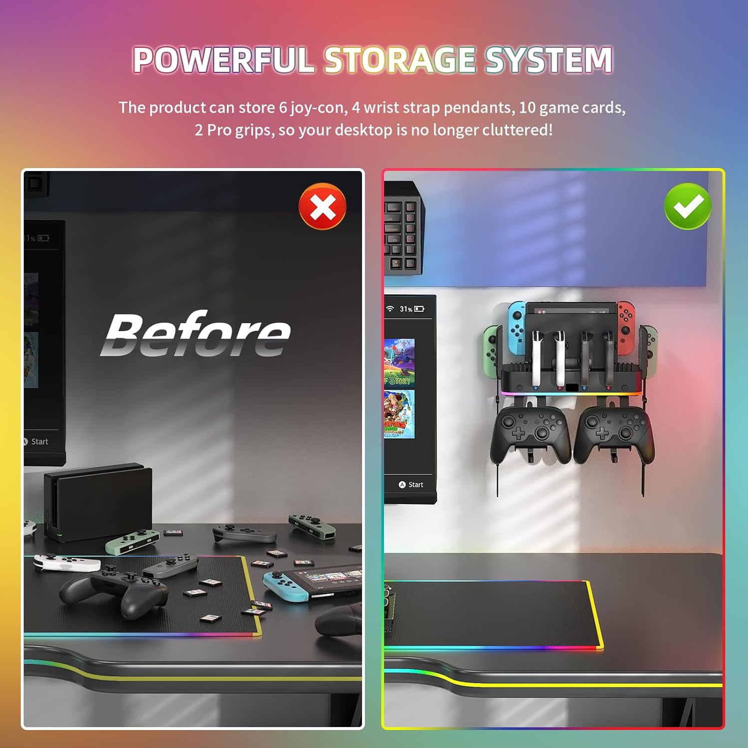 【Multi-version Compatibility】Compatible with nintendo switch and switch OLED, the game console shelf can be used as a game console wall mount behind TV, or a deskstop stand. 4 Anti-slip silicone pad keeps the switch charging station for nintendo stable. RGB hanging decorations protect all switch accessories for nintendo from accidental touch.