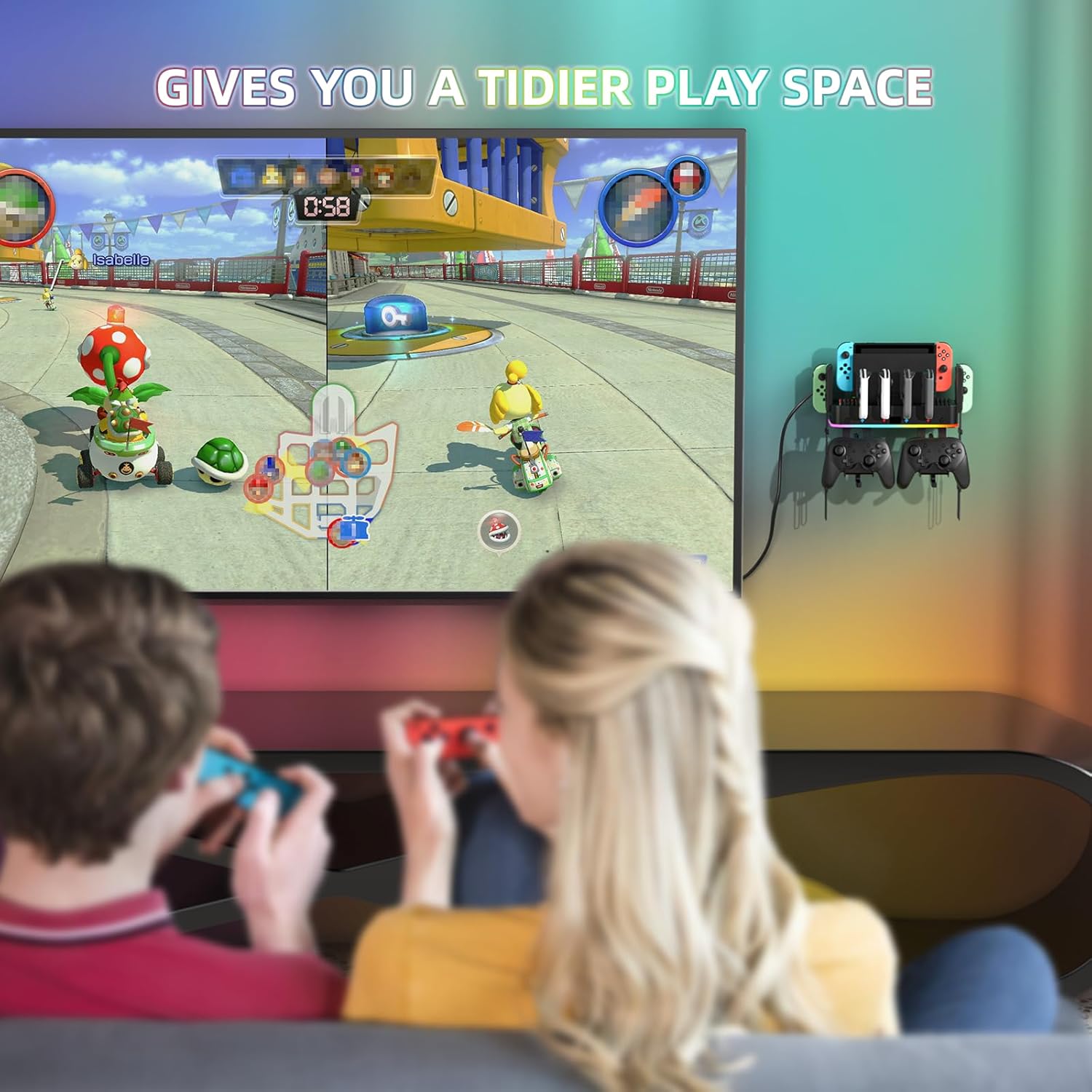 RGB Switch Wall Mount for Joy-Con Charger, Switch Holder for Nintendo Switch 1/ OLED with Switch Organizer, Switch Accessories with 15 Light Mode, 4 Controller Charger, 2 USB Port, 10 Card Slot