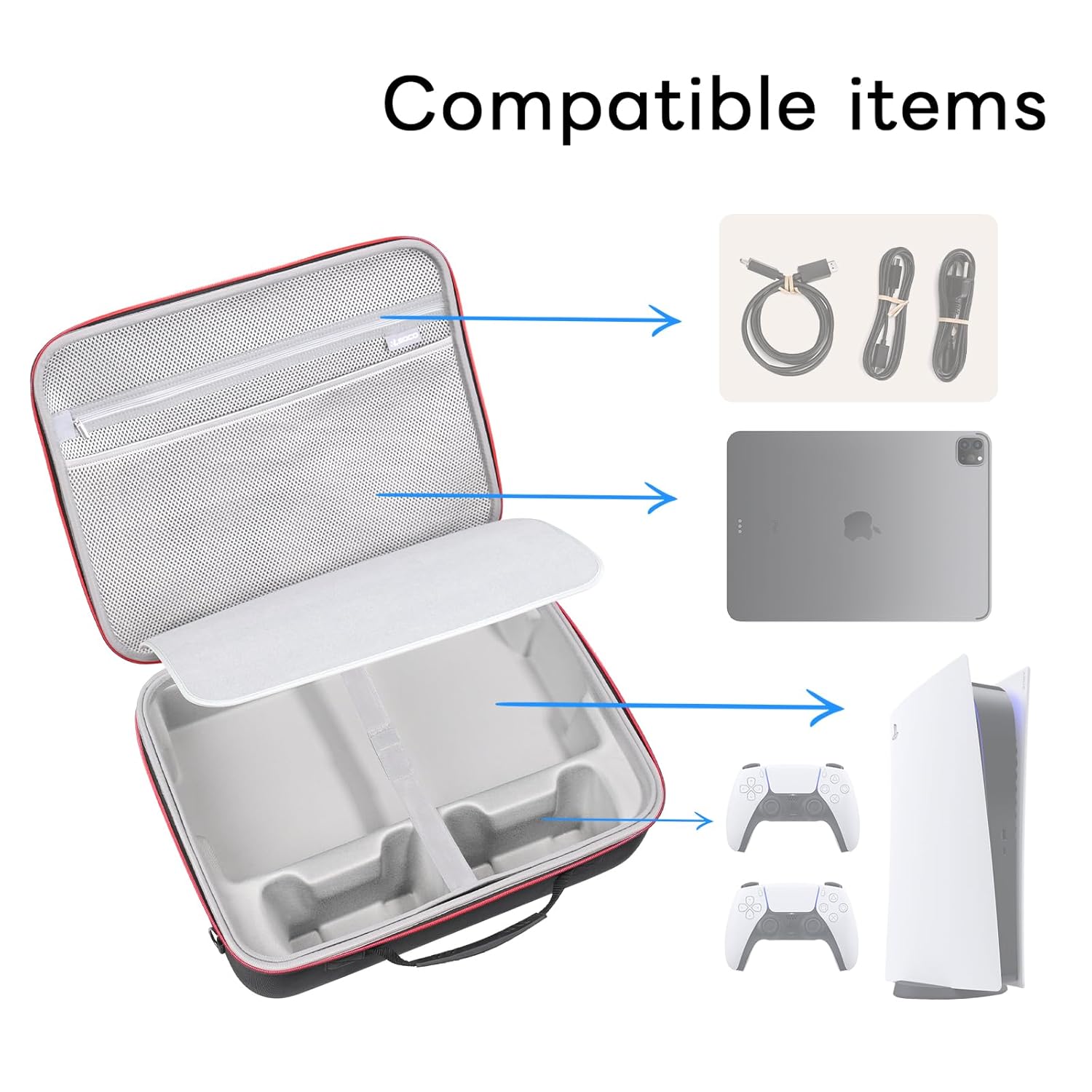 Large Storage Space — This is a space-saving portable case, yet it can hold most of the PlayStation 5 Pro accessories: PS5 Pro Game Console x1,Controller x2,Charger x1,HD Camera x1,Game Screen x1,Charger Adapter & Cable,Game Discs and more. And the bottom tray is removable, you can use it to store other large devices such as small desktops.