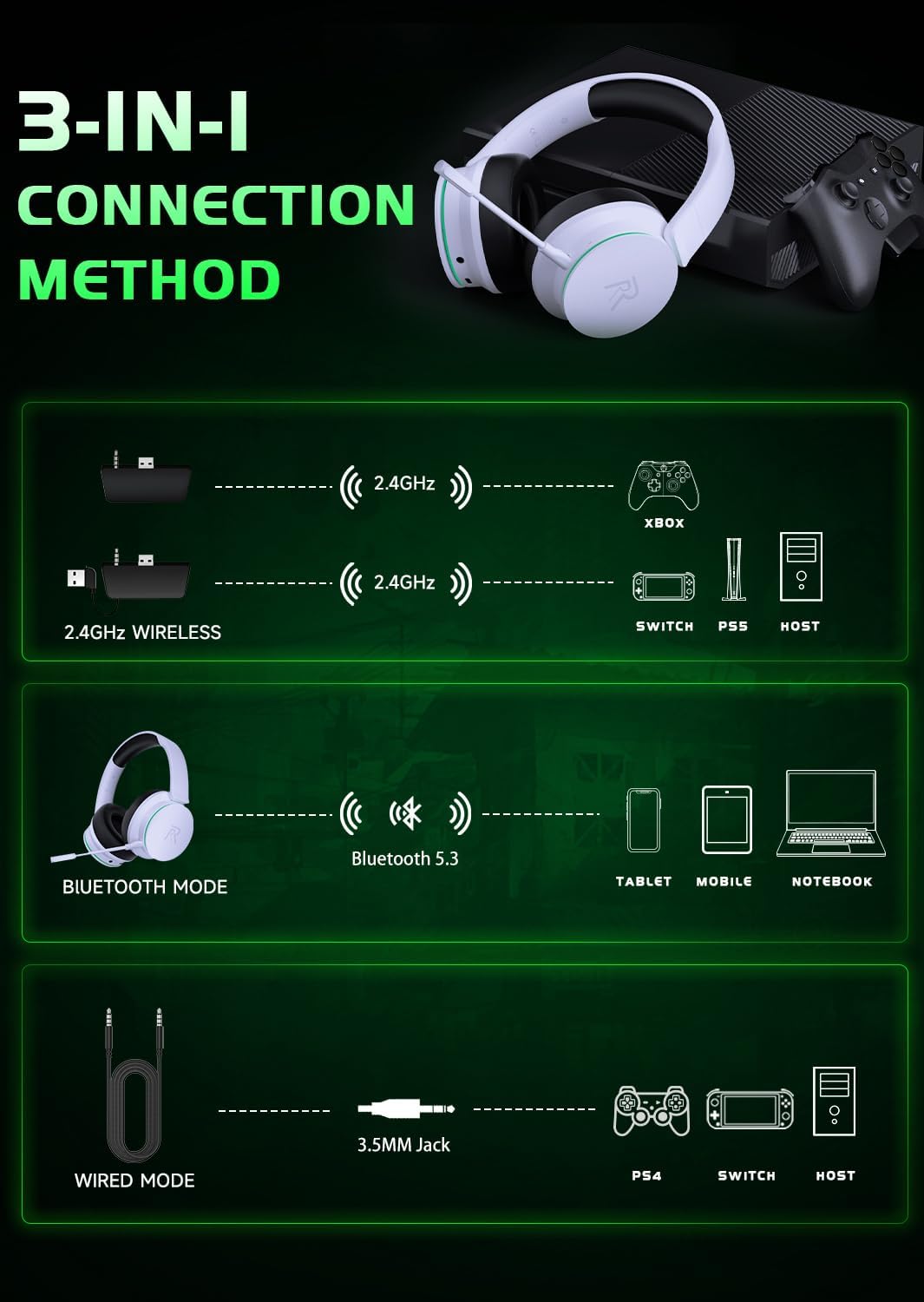Note: To avoid mic issues, ensure the xbox “Headset Chat Mixer” volume is maxed, balance game/chat sound, and firmly plug in the mic. Note: Bluetooth doesn’t support xbox/PS5/4; use 2.4GHz wireless for these devices.