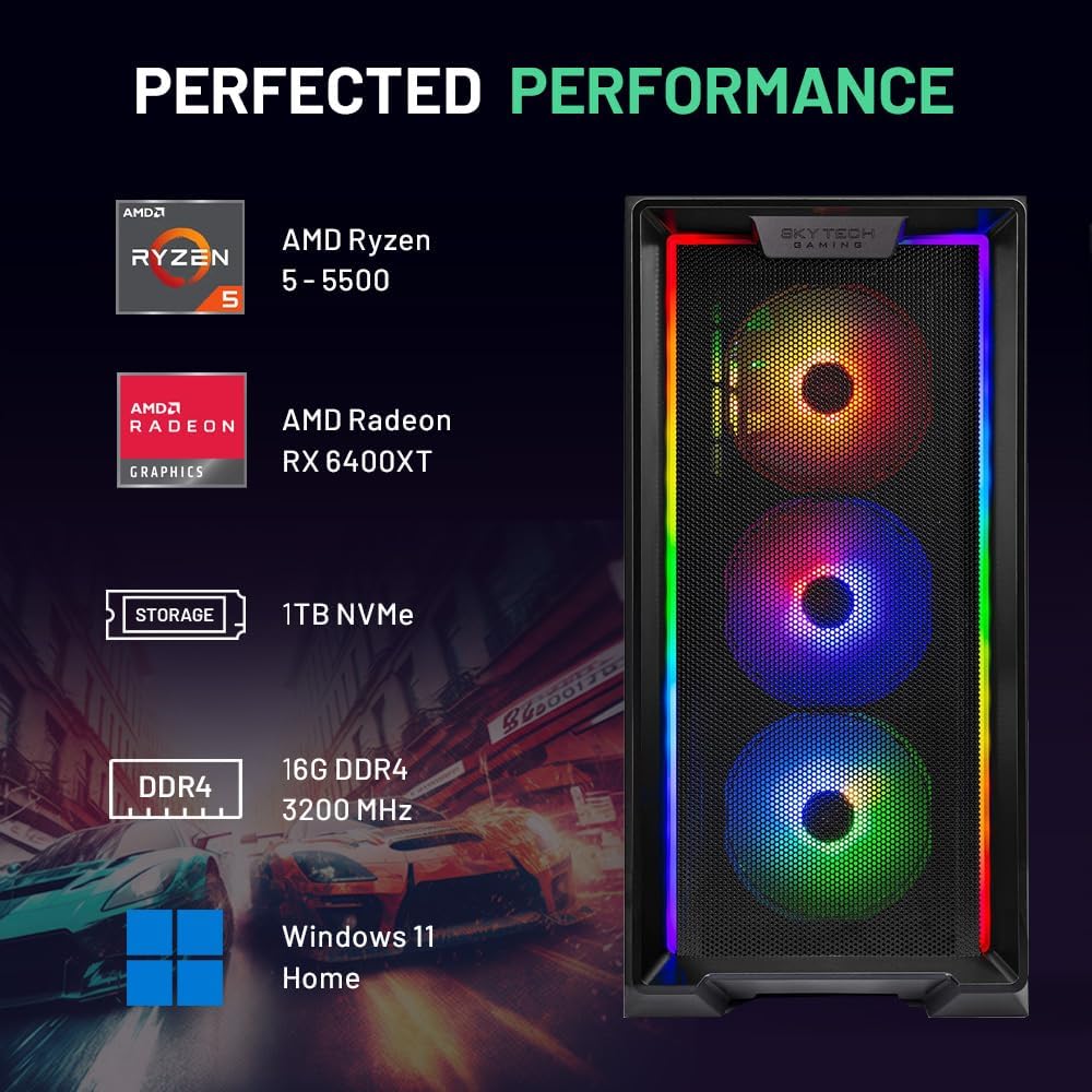 Skytech Gaming Nebula Desktop PC, Ryzen 5 5500 3.6 GHz (4.2GHz), AMD RX 6500XT 4GB, 1TB NVMe SSD, 16GB DDR4 RAM 3200, 650W Gold PSU, Wi-Fi, Win 11