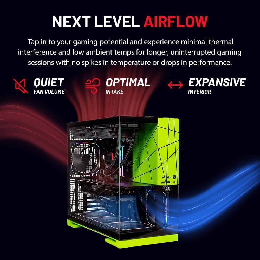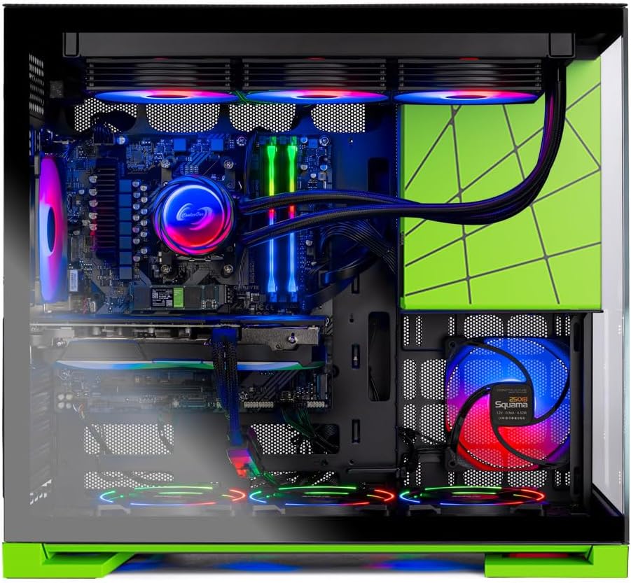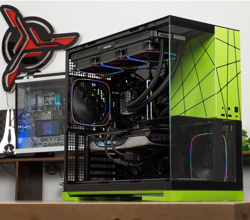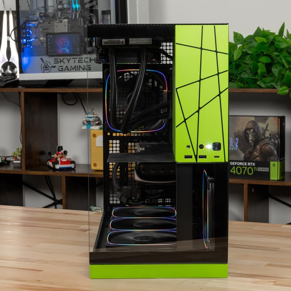High-spec AIO liquid coolers used, delivering unmatched cooling performance for a perfect operational experience and unparalleled cooling performance. With hardware unrestricted by temperature limits, you can unleash its full potential. Whether gaming, creating, or working, you’ll never suffer from thermal throttling again. | Skytech Viper Case with Dual Tempered Glass & Display Platform, Black/Green Edition | 1 Year Warranty on Parts and Labor | Free Technical Support | Assembled in the USA