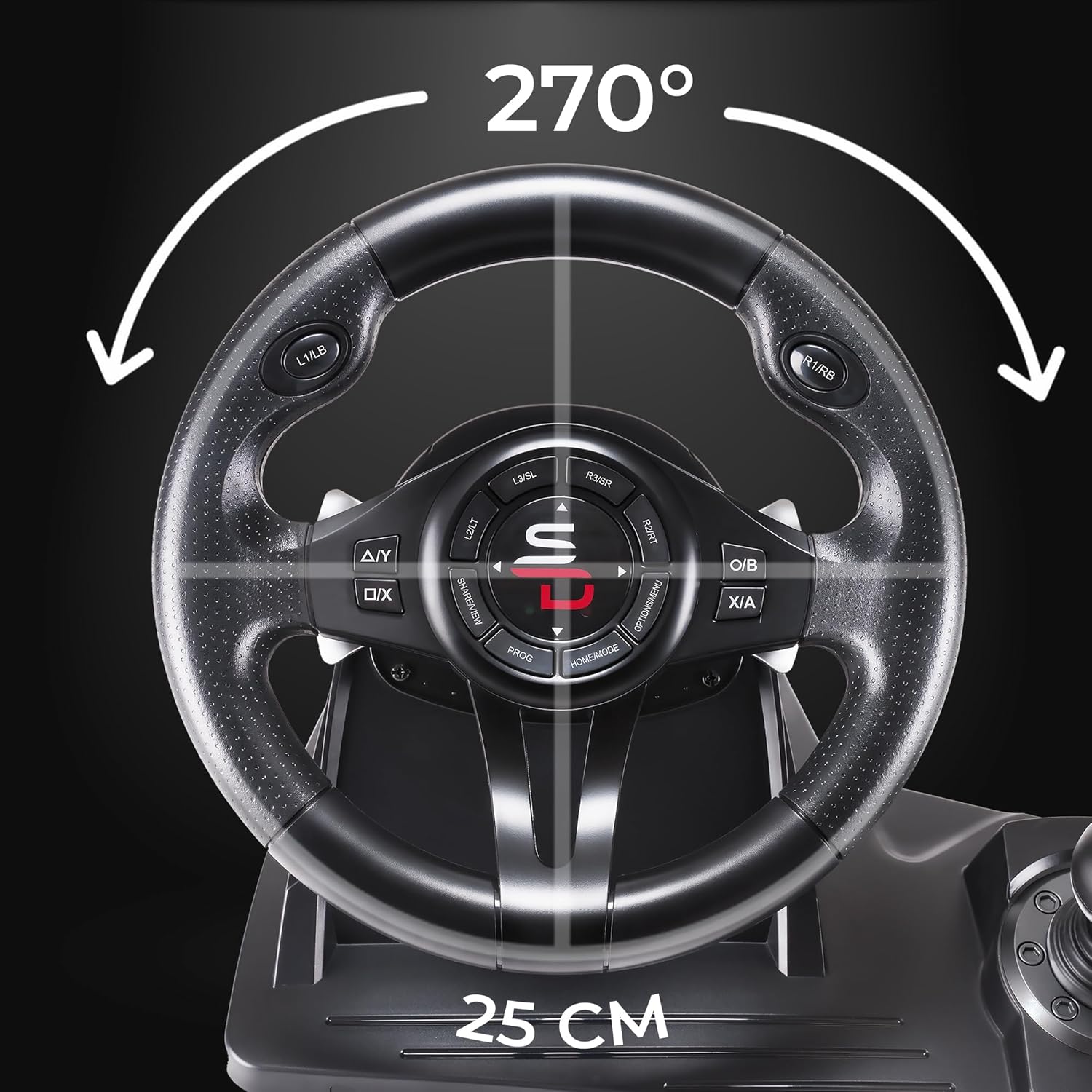 Features: 180 ° rotation Double vibration motor Fully programmable Sensitivity adjustment Compatible with Xbox Serie X, PS4, Xbox One, PS3, PC Gear lever +/- Pedals Anti-sweaty grip coating