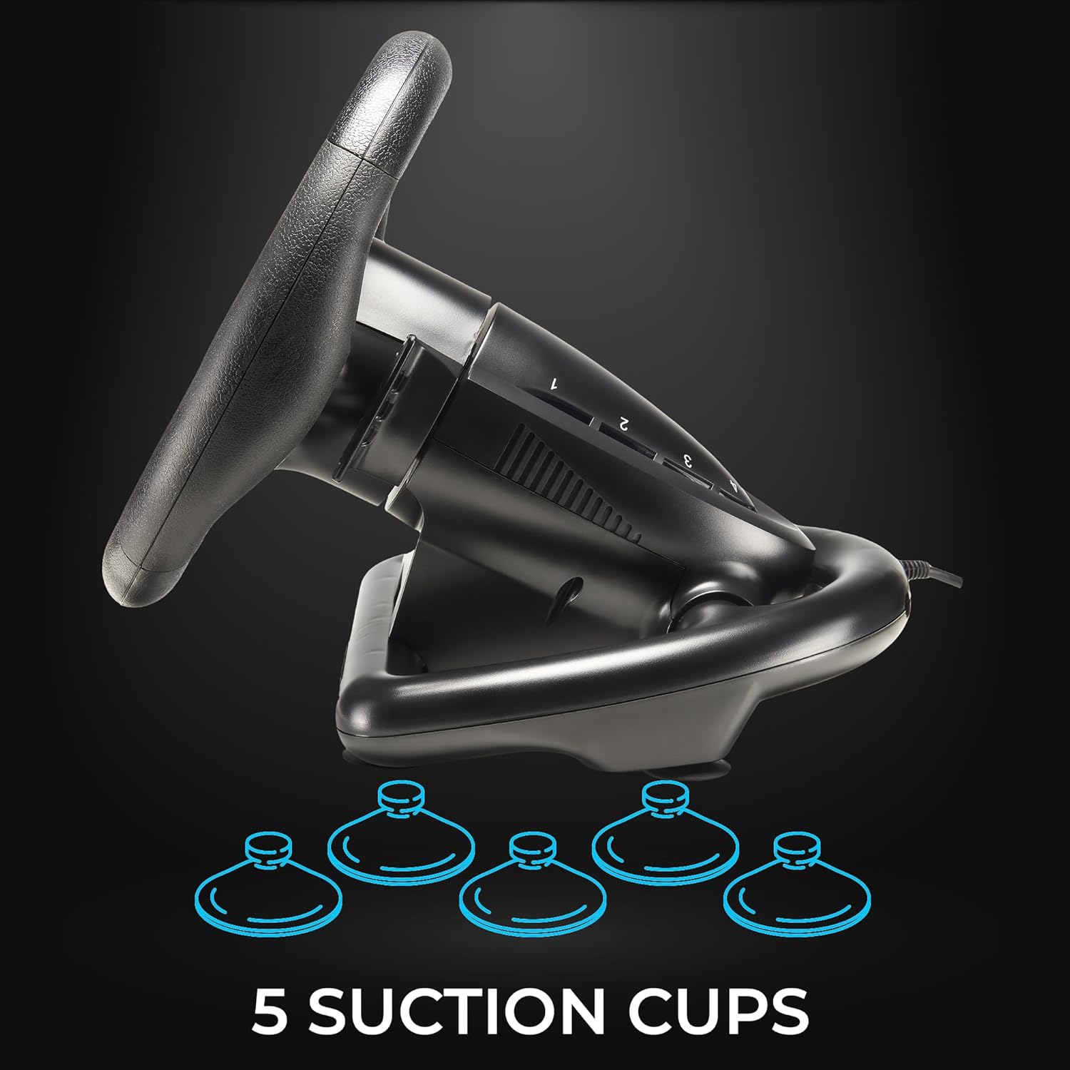 Features: 180 ° rotation Pedal with acceleration and brake Paddles for speed change Programmable keys Sensitivity adjustment Anti-sweaty hand grip coating Suction cups for fixation