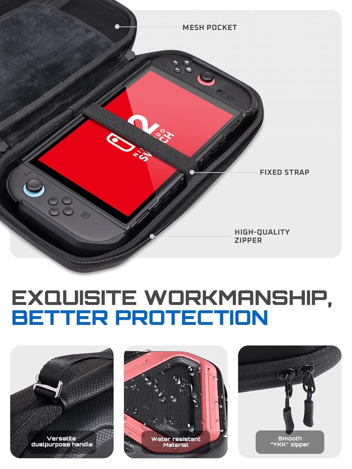 Perfect for Any Adventure: Versatile dual-purpose handle—use as a top carry handle or detachable shoulder strap for effortless portability.Inside the case, built-in elastic straps securely hold your console in place, preventing any movement during transport. It features premium YKK zippers—the gold standard for smooth, reliable operation—ensuring effortless opening and closing every time.Whether at home or traveling, this case is a must-have accessory to keep your Nintendo Switch 2 secure and ready for play anytime, anywhere.