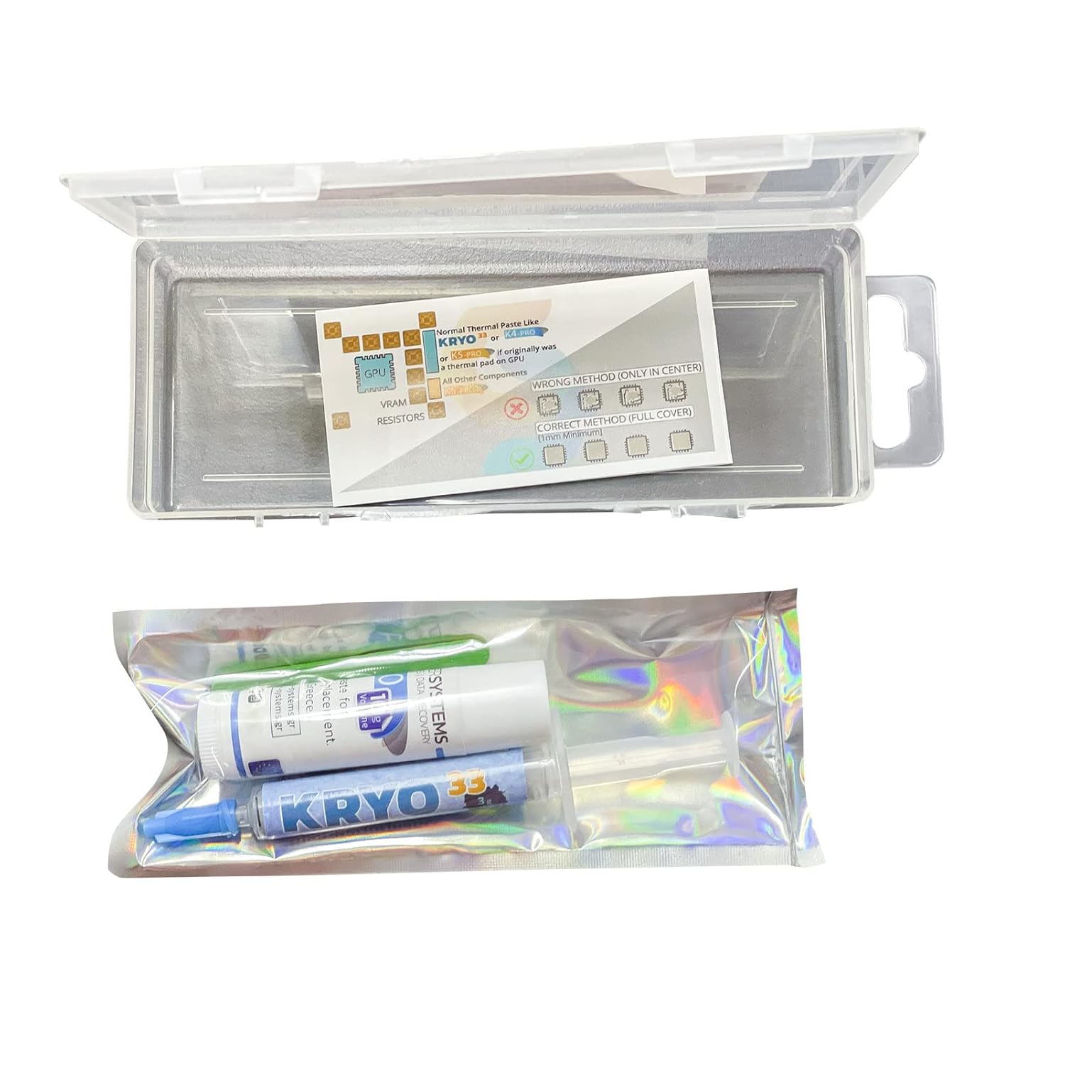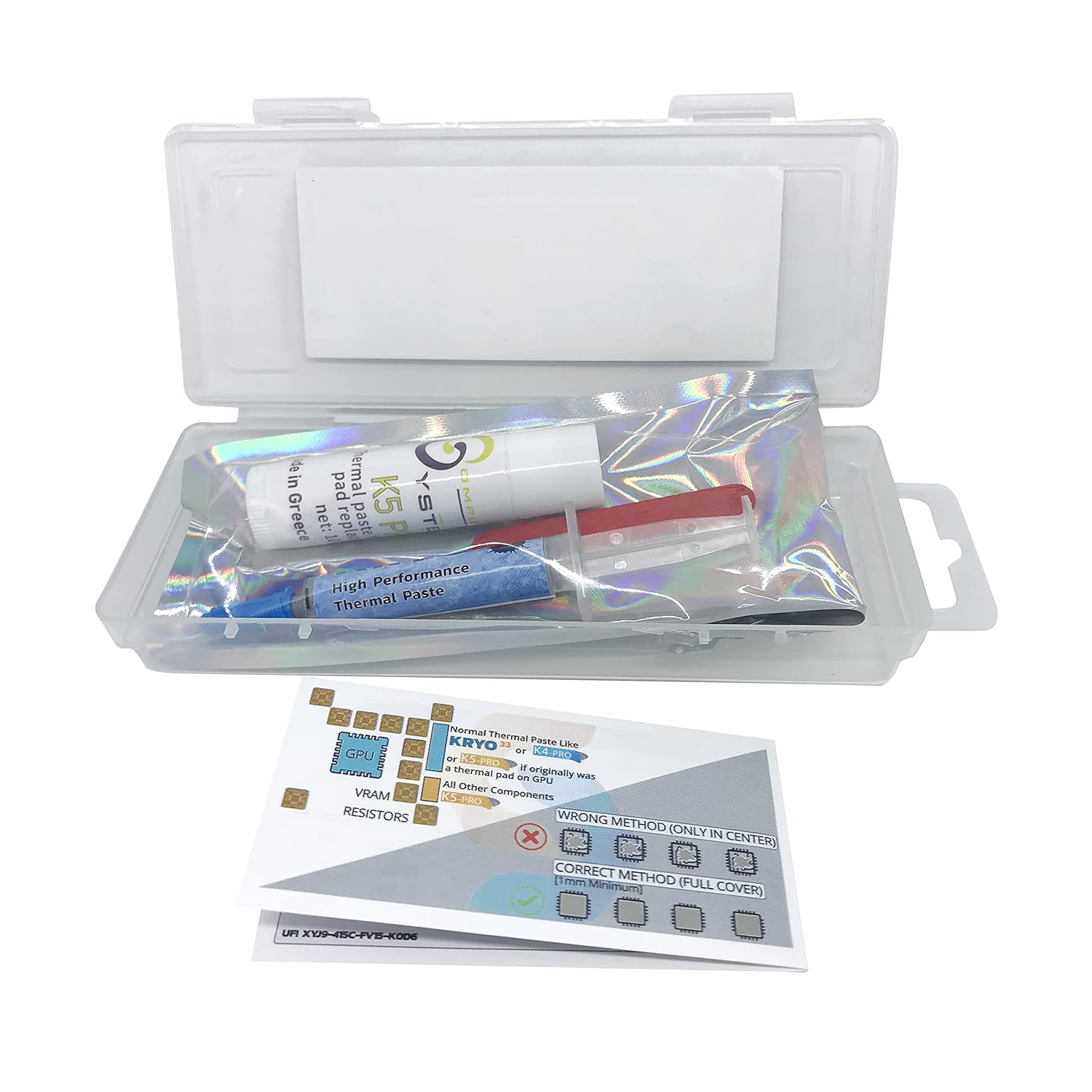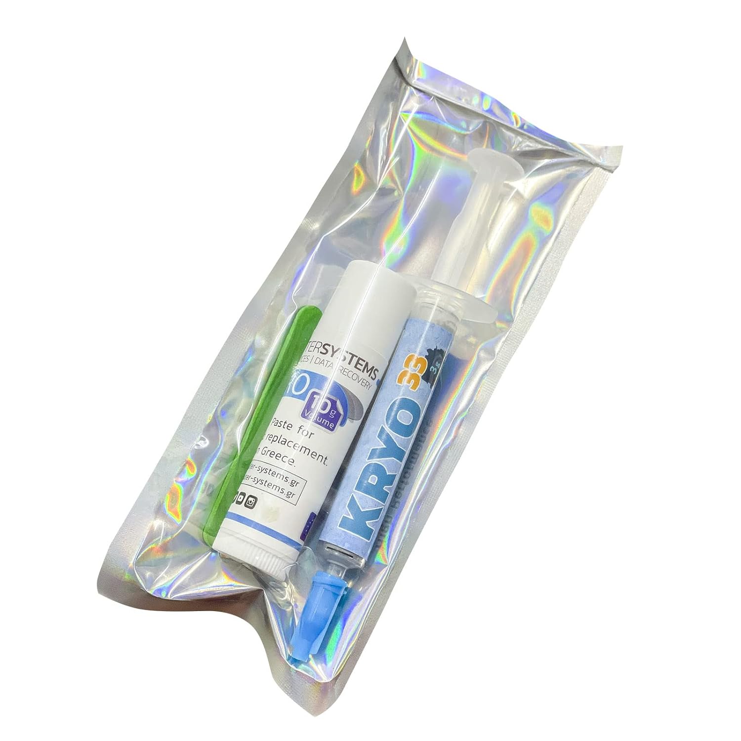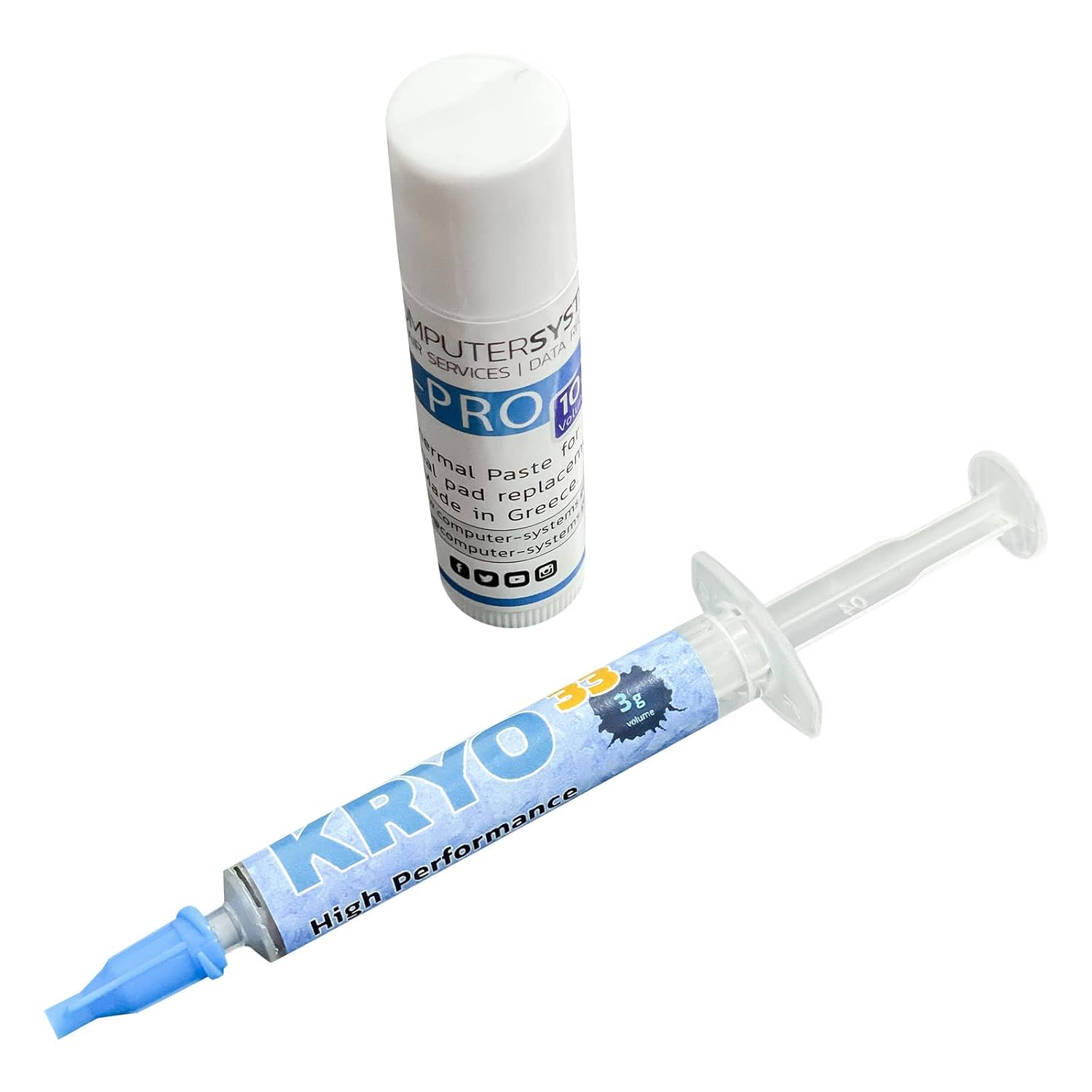 This offer is for a set of thermal pastes which can be used to replace both thermal pastes and thermal pads on laptops, desktops, cryptocurrency video board miners and gamestations compatible with iPhone Apple iMac, Apple Macbook, Sony Playstation 3, PS4, Microsoft XBOX, etc. The set includes 3g of highest thermal conductivity KRYO33 paste and 10g of viscous thermal paste K5 PRO (for use instead of thermal pads on memory chips and other components). You can see our instructions videos in our youtube page ” ComputerSystemsGR “.KRYO33 and K5-PRO are developed and produced by Computer Systems laboratories research team. These products were developed as part of our BGA rework research project with the support of Greece and European Union. With thermal conductivity over 13W/m.k KRYO33 is so effective not only because it’s ingredients have very high thermal conductivity but also because their particles have the minimum possible size. With particle size ranging at 30nm KRYO33 behaves like viscous liquid while it is actually a cream of solid but very small particles. For this reason we know for sure that KRO33 have the maximum thermal conductivity that any thermal paste can reach without using electrical conductive materials (like metals). KRYO33 can be perfectly combined with K5 PRO since both consist of very small particles. This way they allow heat sink to reach minimum possible distance from warm component even if heat sink is not flat at all areas. At the same time all gaps between heat sink and component, even the invisible gaps on metal surface, are filled with thermal conductive materials. Key features Zero electric conductivity Can be applied on all surfaces of electronic components and PCBs even on aluminum Color Gray Specific gravity 2,9 (30% lower than competitive products so less weight is needed for same surface) Certification Reach, ROHS, CE Electric, CSGR.