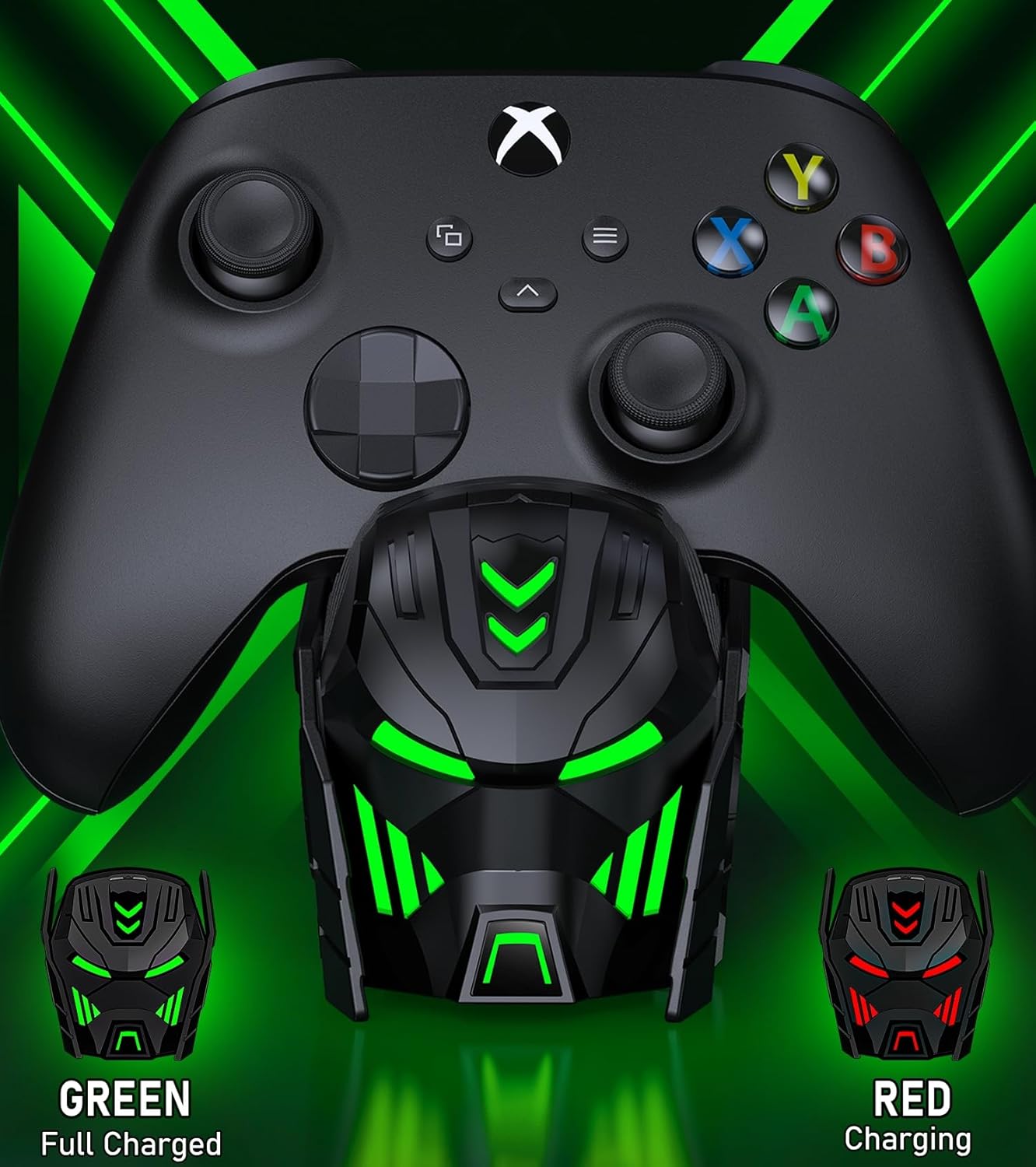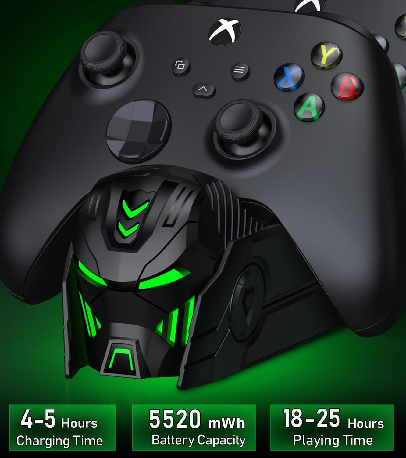 【Cool Design】With its Robot helmet-inspired aesthetic, immerse yourself in the world of superheroes as you recharge your controllers and prepare for epic gaming battles ahead. The xbox one controller charging dock features cool LED ambient light. The touch button allows you to control the LED light, with mode of ambient light available: red-color breath light when charging, solid green light when fully charged and LED off mode