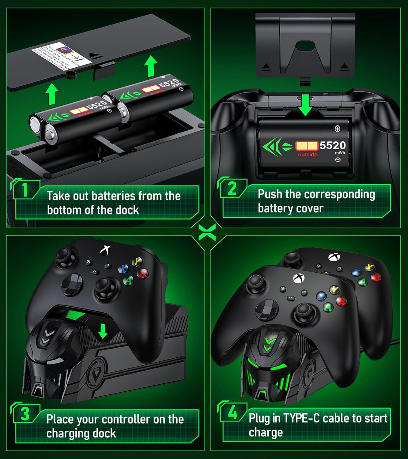 【Easy to Use and What You Get 】Just plug and charge. The dual-controller charging stand for Xbox series s/x provides you with a convenient and comfortable way to store and charge your Xbox controllers, giving you a better gaming experience. What you get: 2 X5520 mWh Xbox one rechargeable battery, 1 X Charger Dock for Xbox series x rechargeable battery pack, 1 X USB C charging cable, 1 X User Manual (xbox controllers are Not Included)