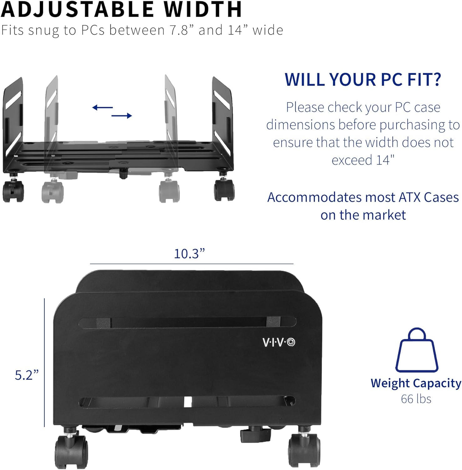 Fits 7.8” to 14” Wide PC’s: Cart is adjustable from 7.8” to 14”, allowing it to accommodate most ATX cases on the market. Note: Please check your PC case dimensions before purchasing to ensure that the width does not exceed 14”