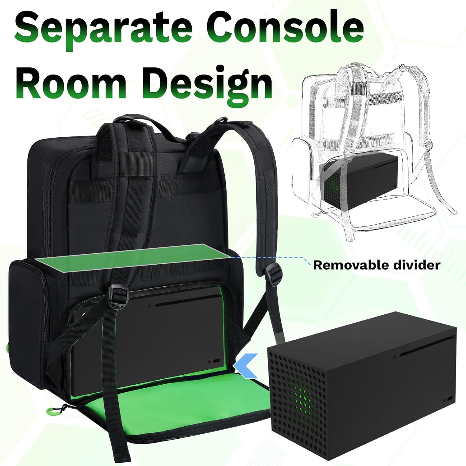 Ingenious Design: The backpack measures 15.74 L x 9.85 W x17.7 H. Its main compartment, split into two sections by a removable divider with 3-sided touch fasteners, has an upper section for headphones or other Xbox accessories and a lower section for the Xbox Series X console—with a separate bottom zip for easy access, preventing scratches from other items. There’s also a rear compartment for a 15.6” laptop