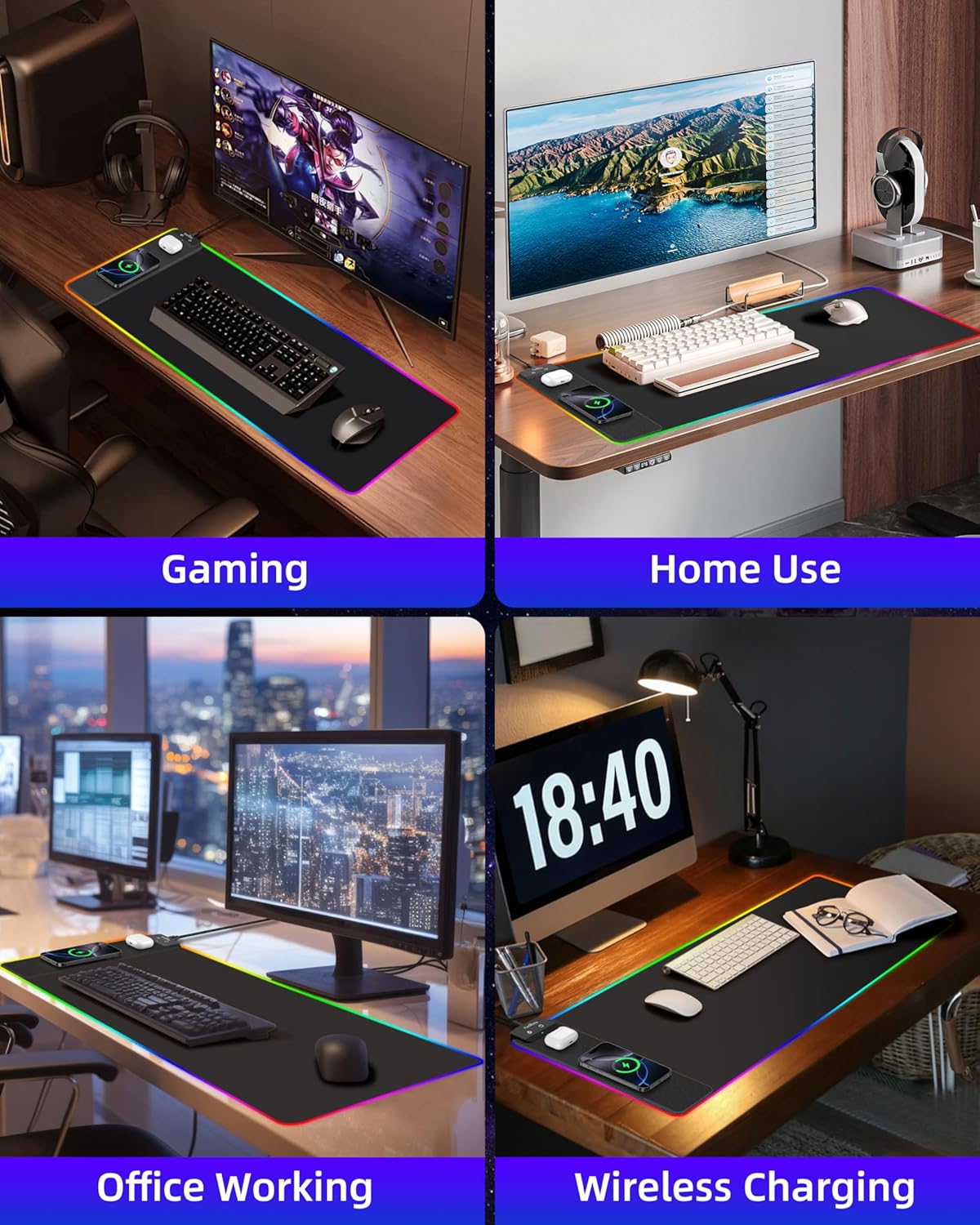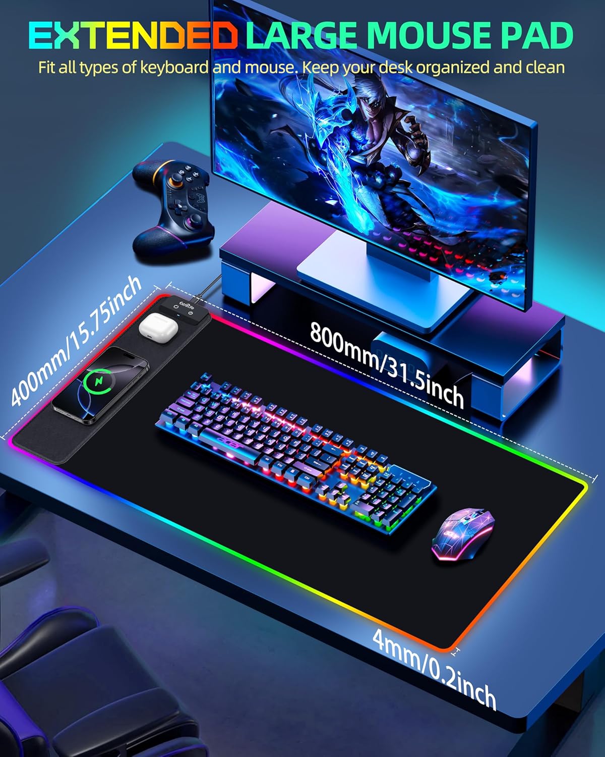 Wireless Charging Mouse Pad, RGB Gaming Mousepad, 31.5″x15.7″ Extra Large Desk Pad, 13 Light Modes, Ultra-Smooth Surface, Non-Slip Base, Waterproof Computer Keyboard Mat for MacBook, PC, Laptop, Black