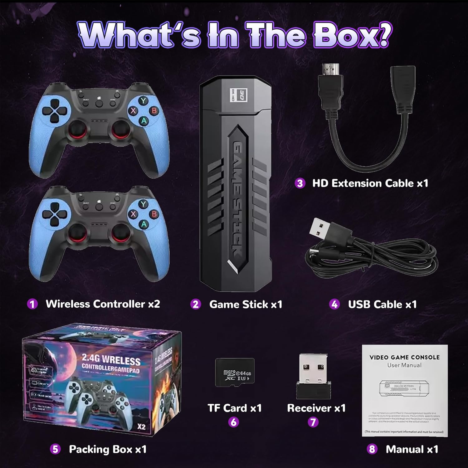 SUPPORTS 4K HD OUTPUT AND MULTI-LANGUAGE SYSTEM COMPATIBILITY:This 4K game stick connects to your TV via HD,supporting HD output with seamless transition between 1080P and 722P—adapt dynamically for movie-quality visuals or low-latency gaming,allowing you to enjoy the fun of playing games on a large screen.This retro gaming console system supports six languages,including English,Russian,and Spanish,with a simple menu interface that makes it easy for players of different languages to operate
