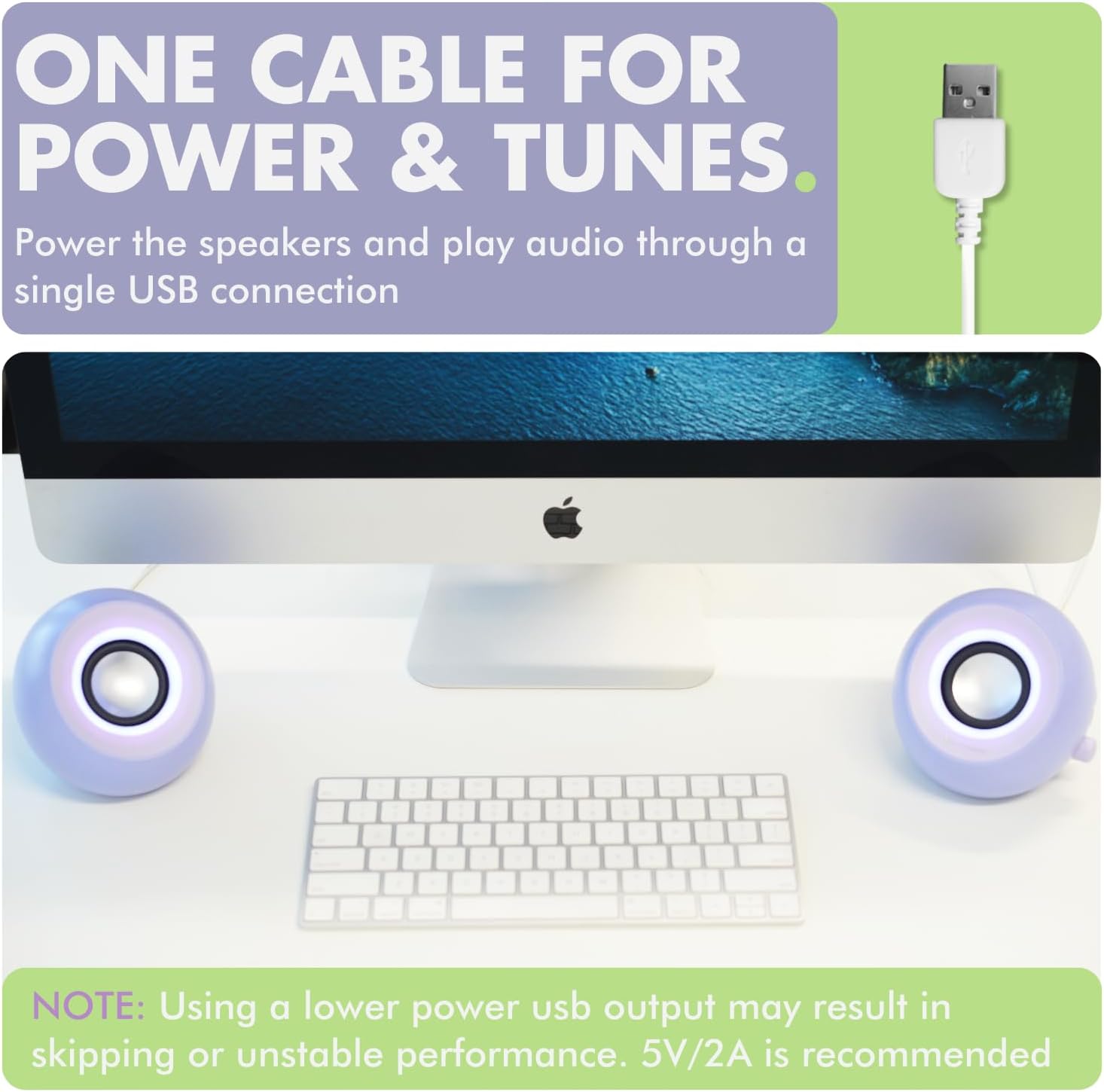 (CUSTOMIZABLE LED LIGHTING) Cycle through 10 vibrant LED color options on our purple pc speakers for desktop or turn them off for a clean and calm workspace.