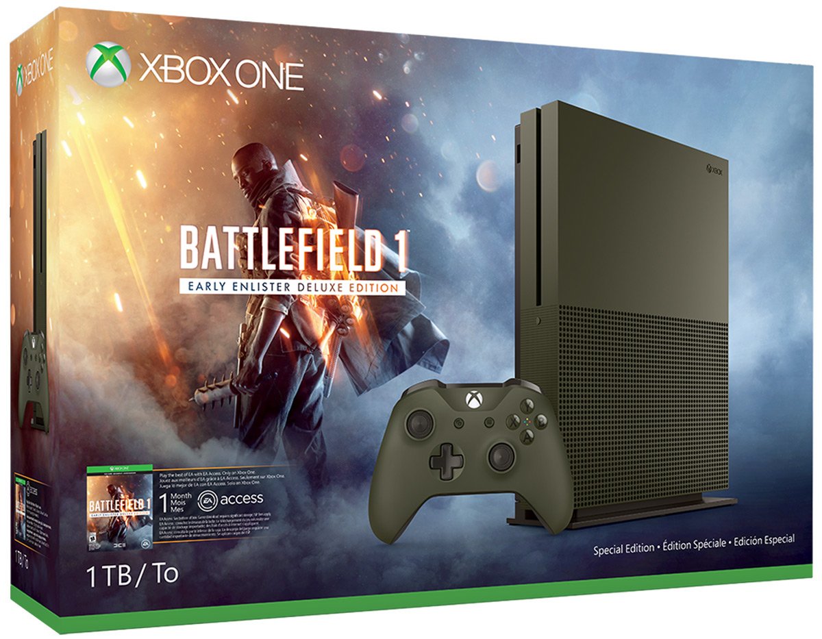 This bundle includes: Xbox One S Special Edition 1TB Console, military green stand and controller, HDMI cable (4K Capable), and power cable