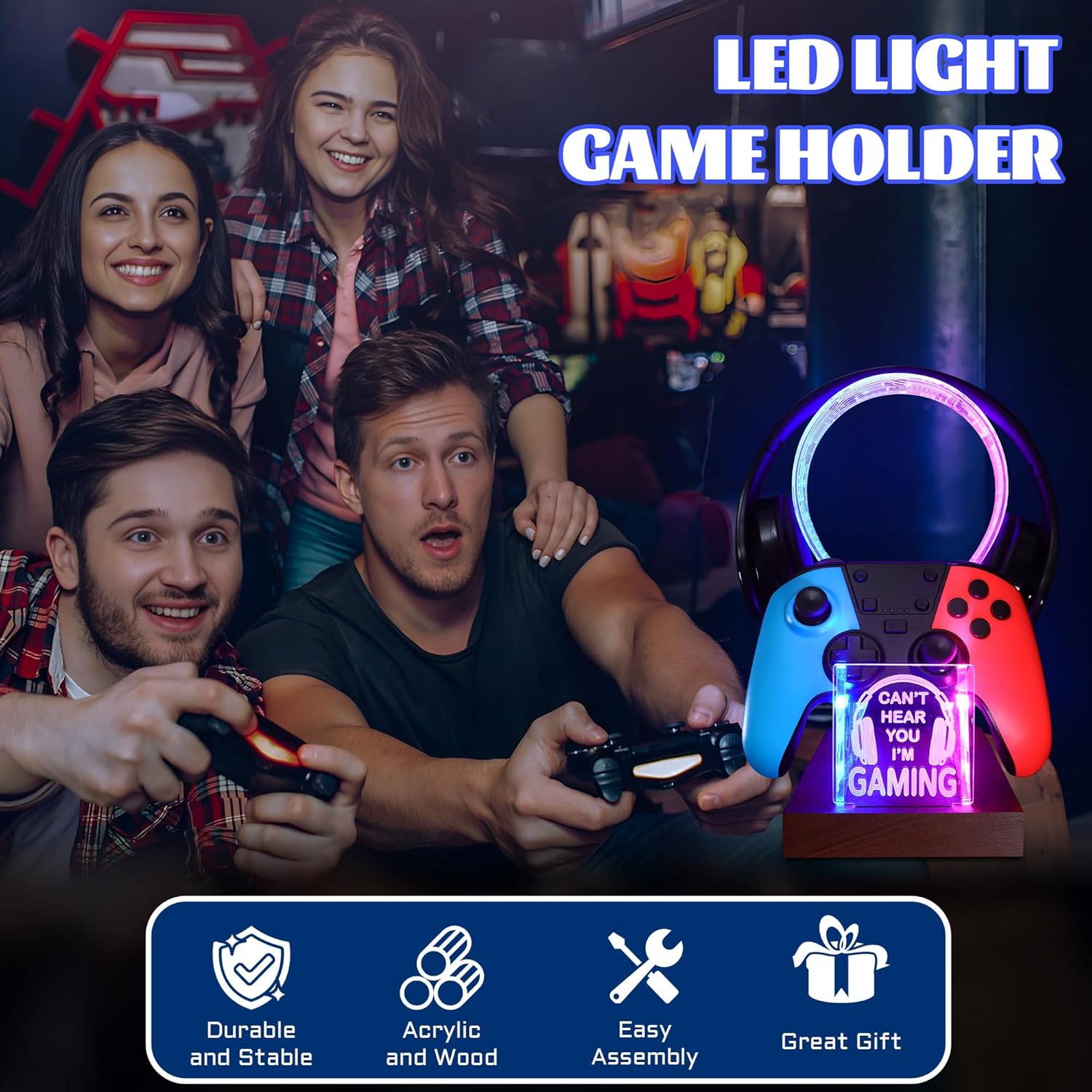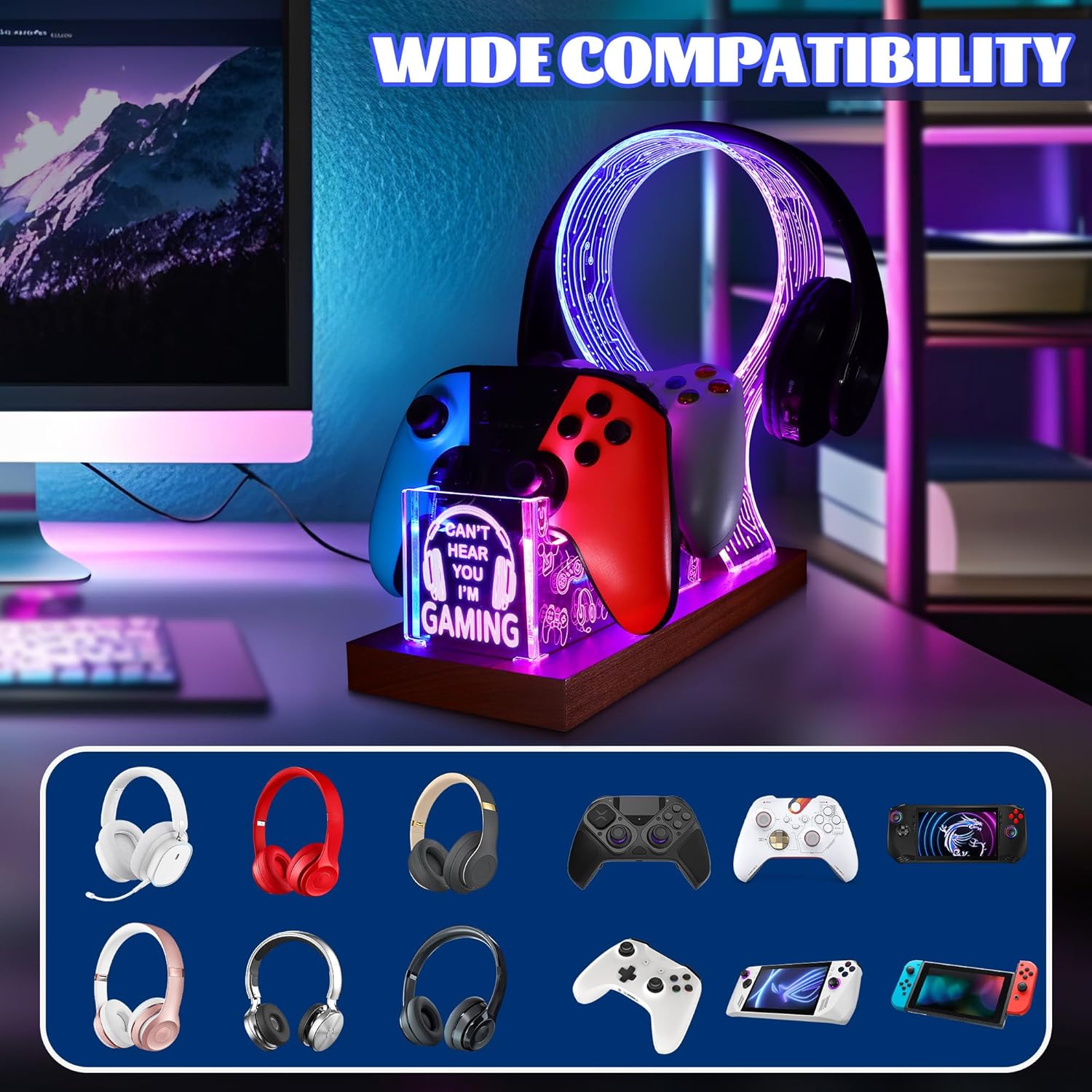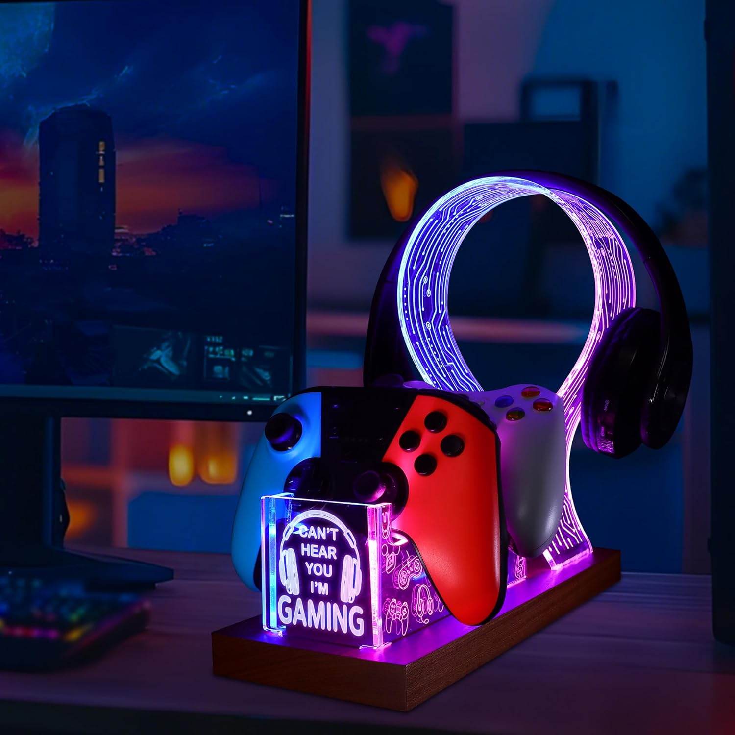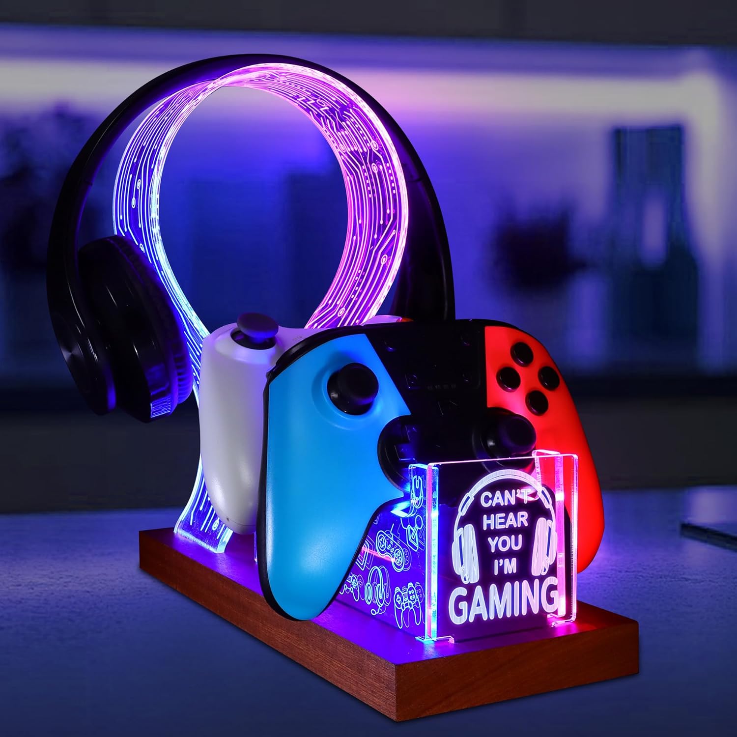 YuanDian Gamer Gifts for Teenage Boy, Can’t Hear You I’m Gaming Headset and Controller Stand, Acrylic Wooden Controller Holder with Blue Pink LED Night Light, Desk Decor Gift