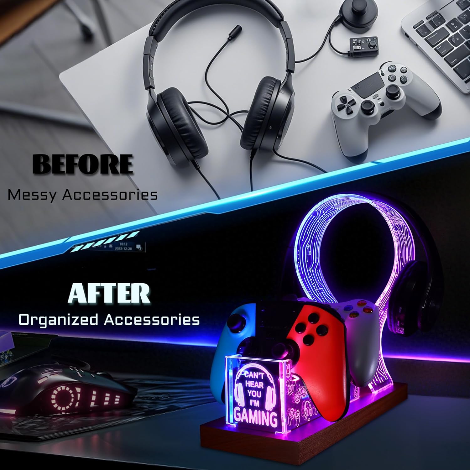 Effortless Assembly and Use: With just 4 parts that easily snap together in under 30 seconds, you’ll have a sleek and stylish headphone controller stand that fits any brand of headphones and gamepads for displaying or storing them when not in use, which combines style and convenience for a seamless experience. Use USB cable to connect to keep the light on.