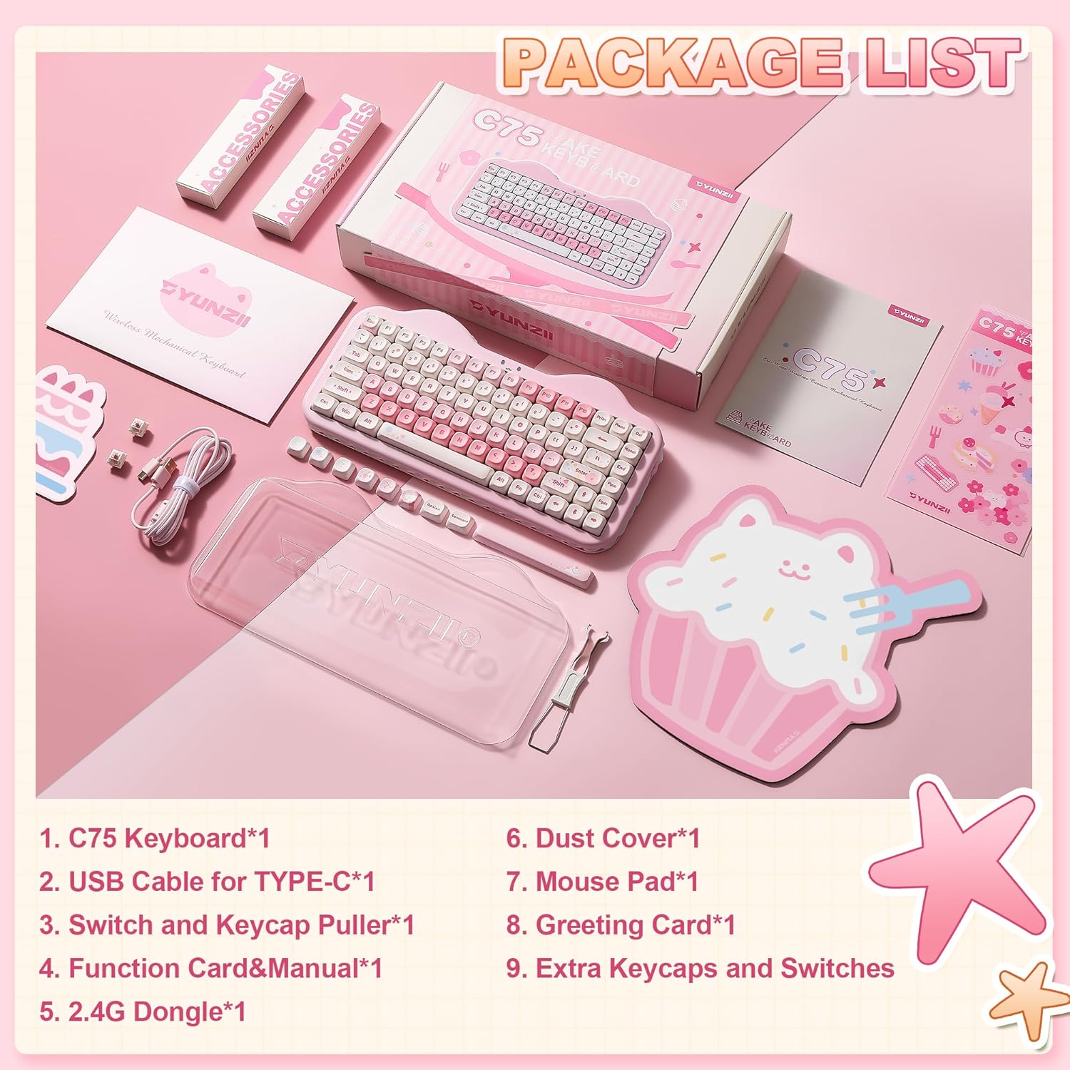 Cute Cake Keyboard 75% LAYOUT: The new YUNZI C75 cute mechanical keyboard series, a sweet addition to desk accessories with colorful keyboard design. Boasting all the beloved features—high-quality mechanical keyboard, compact 75% layout Keyboard, wireless, BT and wired connectivity, and creamy typing sound. This cute wireless gaming keyboard shines as a gift or a charming setup to home, office, workspaces, and gaming stations