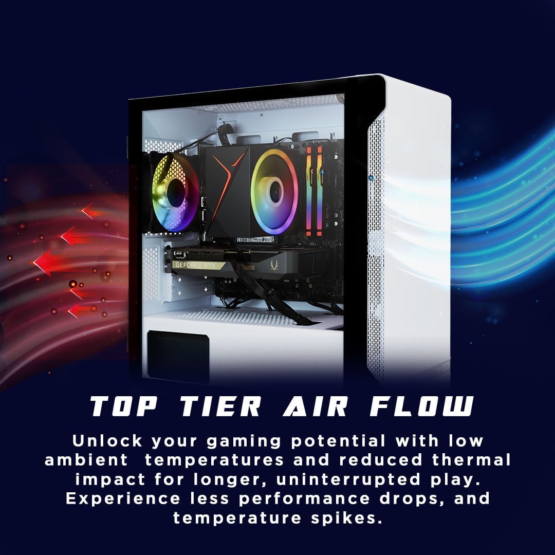 Well-Rounded: 16GB RGB DDR5 5200 MT/s RAM, 1TB NVMe SSD, and 650W 80+ Gold PSU provide quick loading times and stable power. Connections: HDMI, DisplayPort, WiFi 5, Bluetooth 5.2, 7.1 HD Audio.